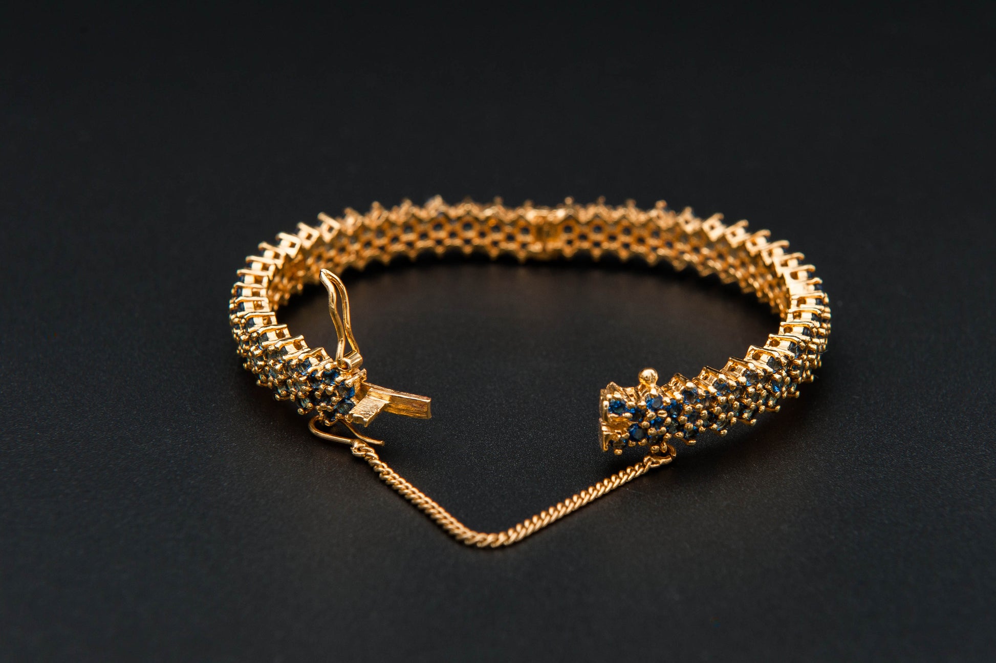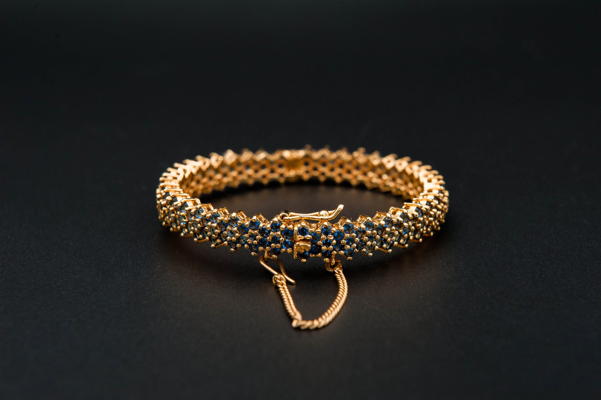 The Azure Cluster Bracelet is a bold expression of color and craftsmanship. Made from 925 sterling silver and enriched with 24K gold plating, it features a densely packed arrangement of vivid blue gemstones that shimmer across the wrist. The secure clasp and safety chain ensure elegance meets practicality, while the intricate layout evokes a sense of regal opulence. Perfect for gala wear, festive occasions, or heirloom styling, this piece commands attention with every glance.
