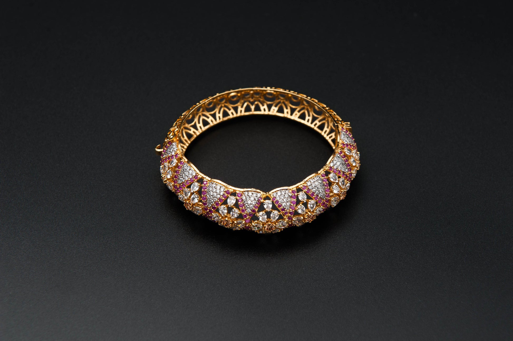 The Rosette Royale Bracelet is a celebration of ornamental bloom and regal detail. Crafted in 925 sterling silver and enriched with 24K gold plating, it features a repeating pattern of floral clusters formed from teardrop-shaped white stones and framed by radiant red accents. Intricate filigree swirls line the inner band, while a safety chain adds both charm and security. Ideal for festive occasions, bridal wear, or heirloom collections, this piece evokes the elegance of garden-inspired grandeur.