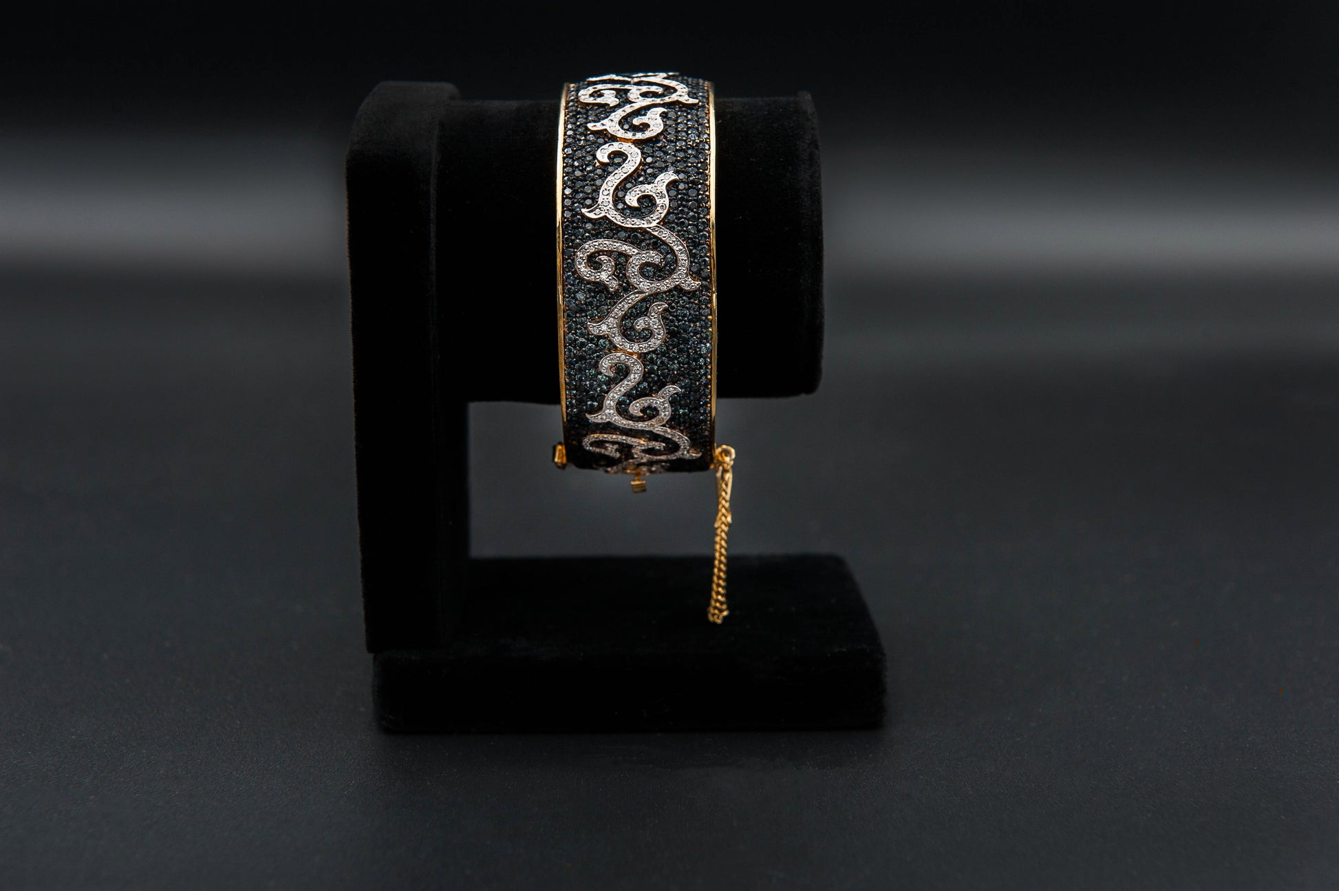 The Gilded Scroll Bangle is a masterwork of ornamental elegance. Crafted in 925 sterling silver and enriched with 24K gold plating, this wide-band bracelet showcases intricate scrollwork and vine-like patterns in silver and black, set against a richly textured backdrop. Gold-trimmed edges and a delicate safety chain add both refinement and function. Whether worn for cultural celebrations or formal occasions, this piece evokes the grandeur of heritage craftsmanship with a modern silhouette.