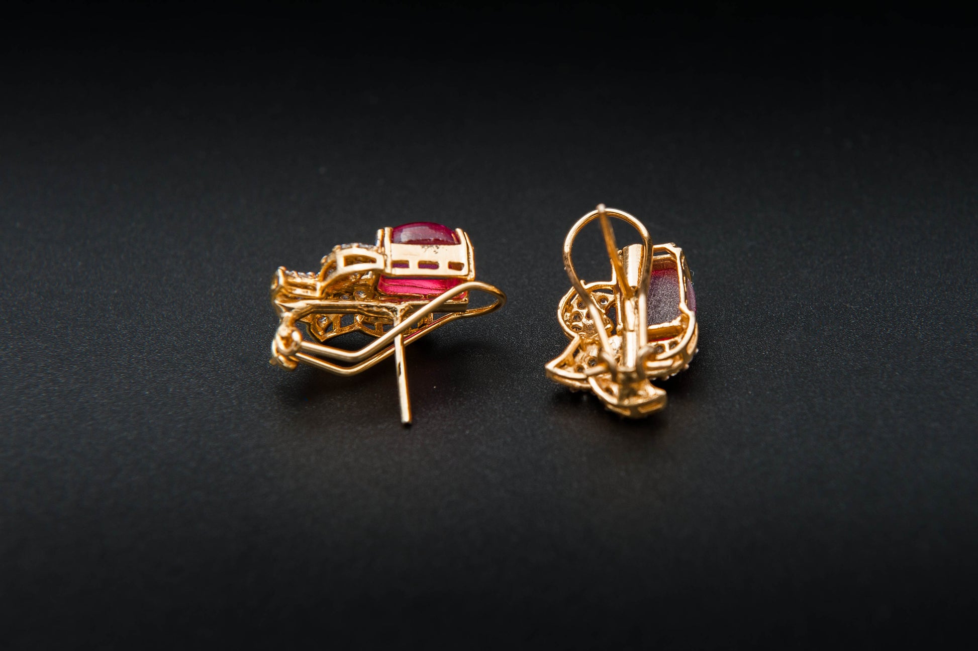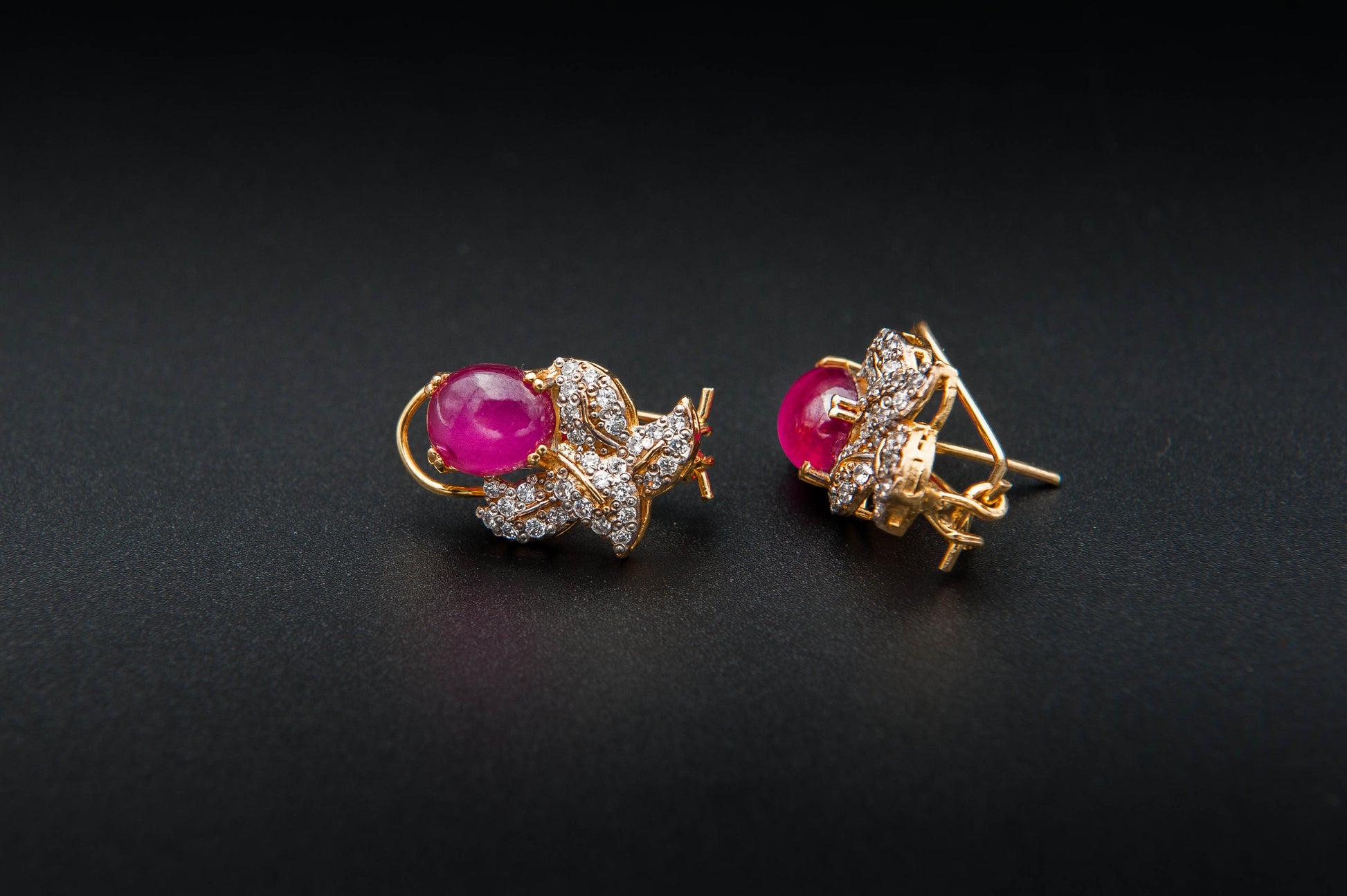 The Rosé Empress Earrings blend regal elegance with radiant charm. Each earring features a prominent oval pink gemstone set in 925 sterling silver and enriched with 24K gold plating. Surrounding the centerpiece is a flourish of floral and leaf-like motifs encrusted with shimmering white stones, creating a luminous halo of texture and brilliance. The warm gold setting enhances the romantic hue of the pink gem, making these earrings a perfect choice for festive occasions, bridal wear, or moments that call for graceful opulence.