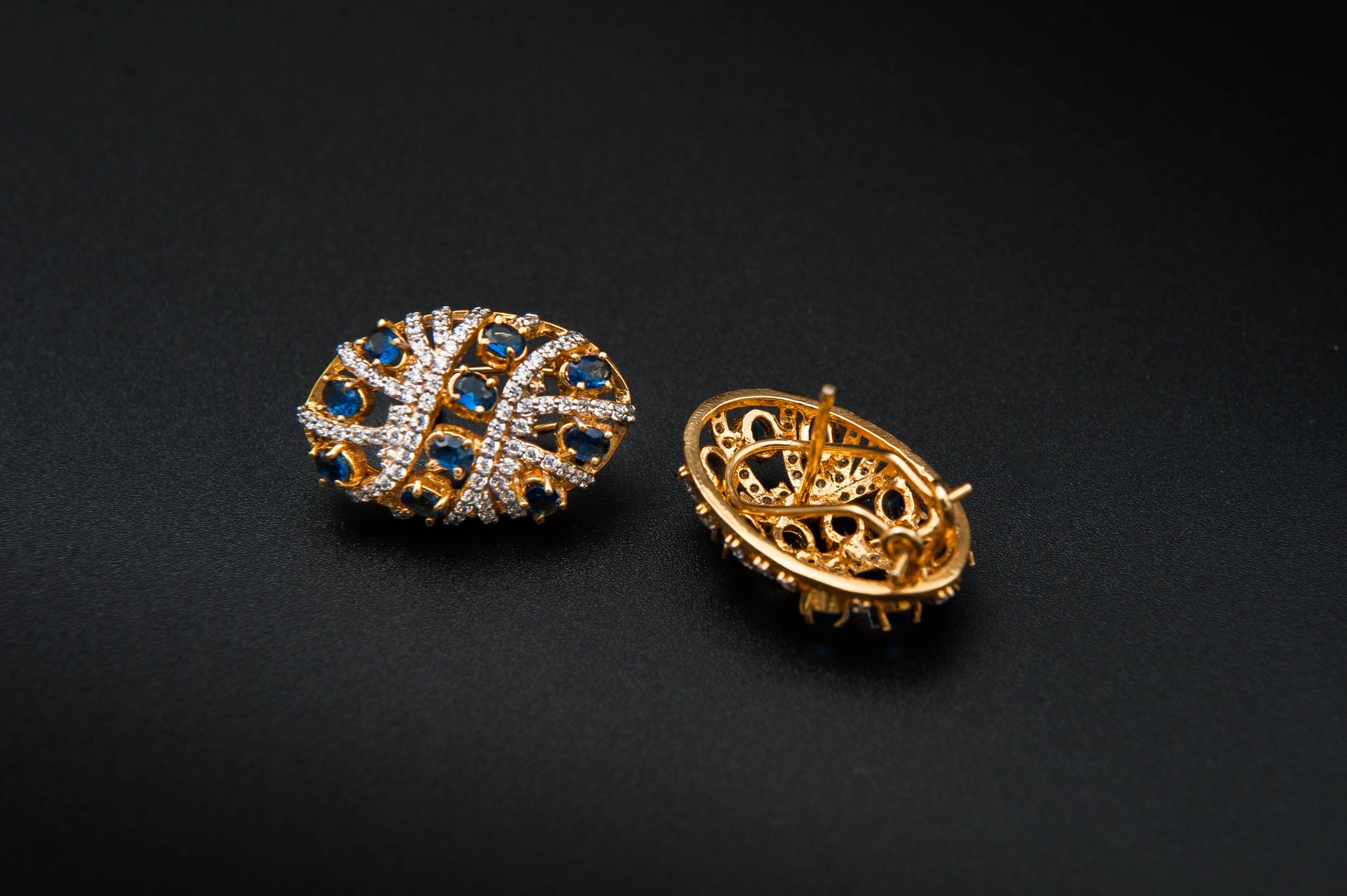 The Midnight Bloom Earrings evoke the mystery and allure of twilight elegance. Crafted in 925 sterling silver and enriched with 24K gold plating, each oval-shaped earring features a lush arrangement of deep blue gemstones set in a symmetrical floral pattern. Swirling lines of clear stones add brilliance and movement, enhancing the contrast between the rich sapphire tones and radiant gold. These earrings are perfect for evening wear, festive occasions, or moments that call for dramatic sophistication.