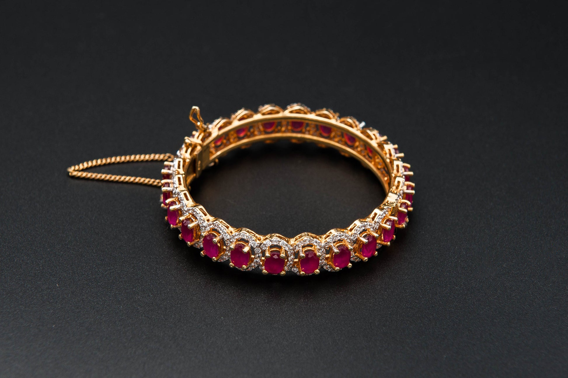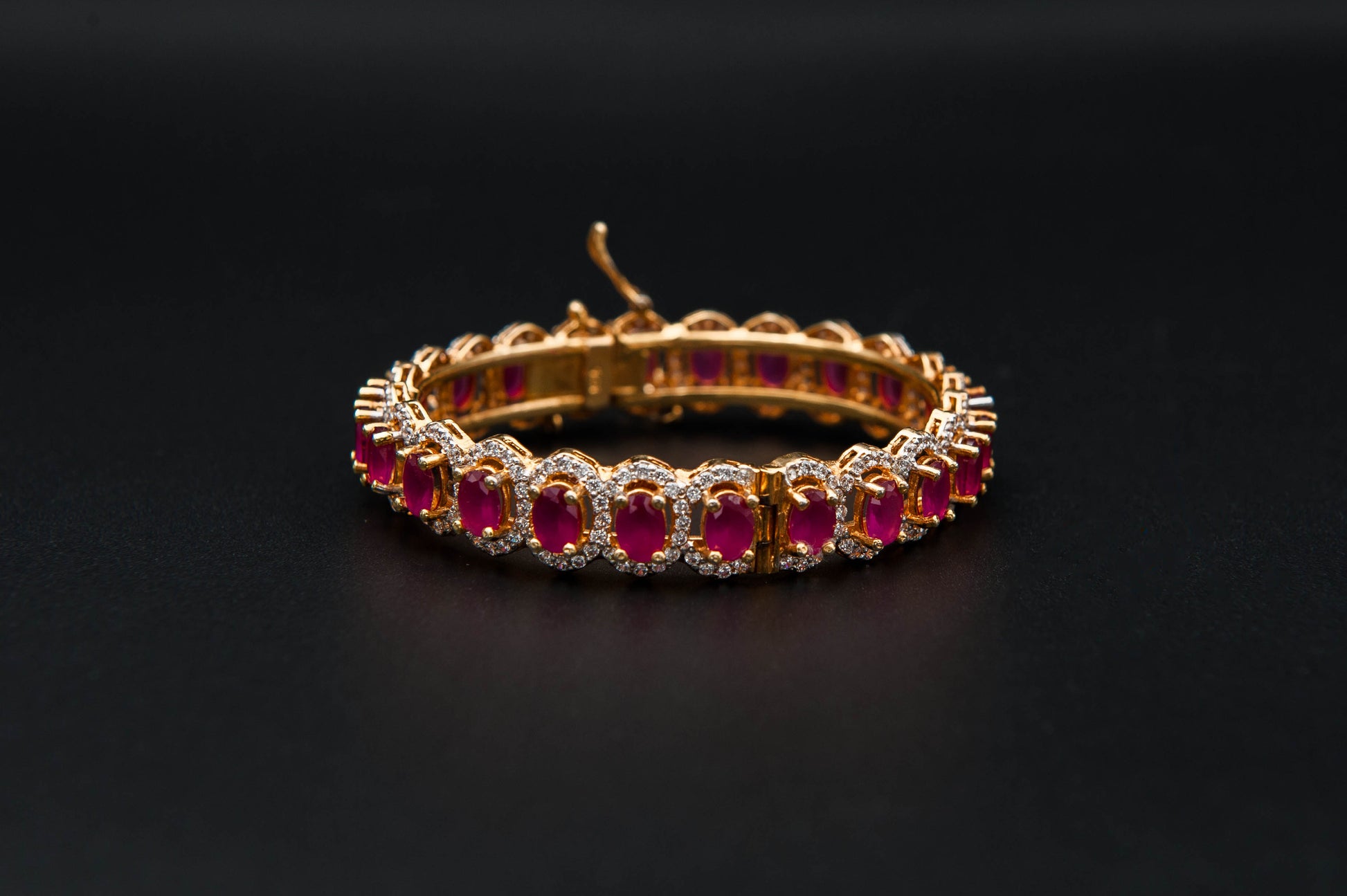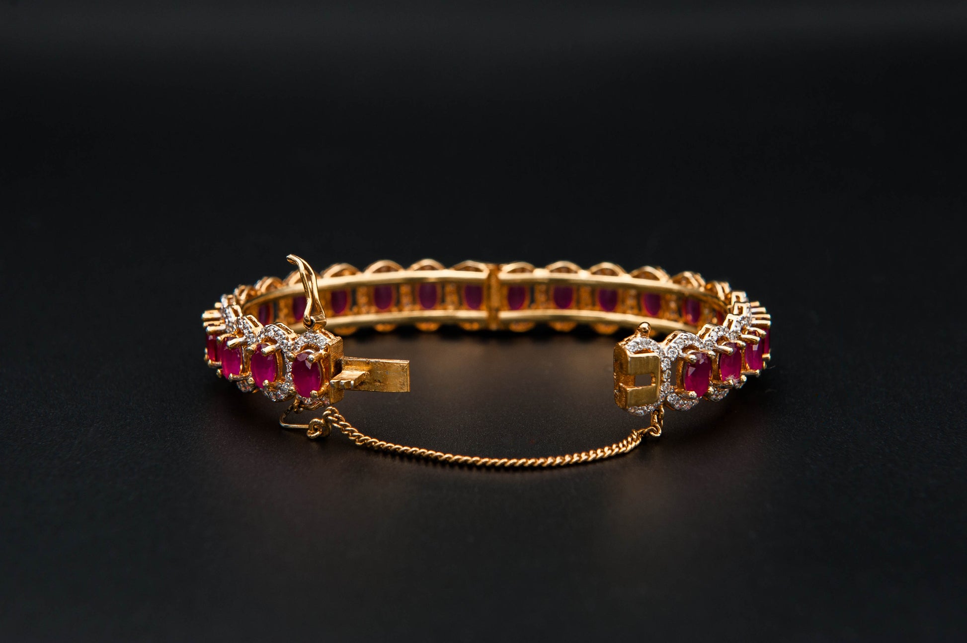 The Crimson Halo Bracelet is a radiant fusion of color and craftsmanship. Made from 925 sterling silver and enriched with 24K gold plating, it features a series of oval-cut red gemstones, each encircled by shimmering white stones that amplify their brilliance. A secure clasp and safety chain ensure elegance meets practicality, making this bracelet ideal for formal occasions, bridal wear, or heirloom collections that celebrate bold beauty.