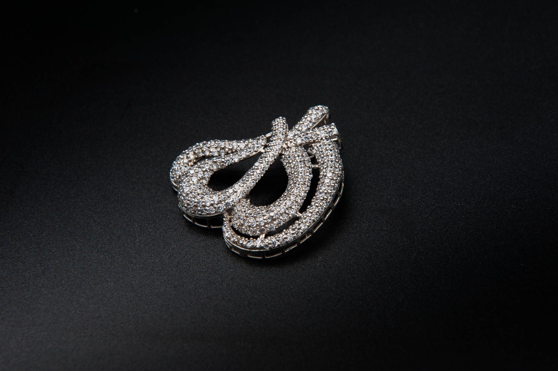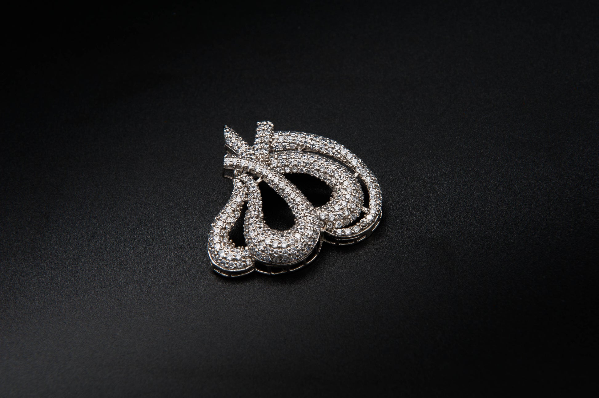 This pendant—or possibly a brooch—is made from 925 sterling silver and features a symmetrical, looped design that resembles a stylized heart or teardrop. The entire surface is encrusted with small, sparkling stones that give it a luxurious, high-shine finish. The craftsmanship is precise, with clean curves and balanced proportions, making it an elegant accessory suitable for formal wear or special occasions. The black background enhances the brilliance of the stones and highlights the refined details of the piece.