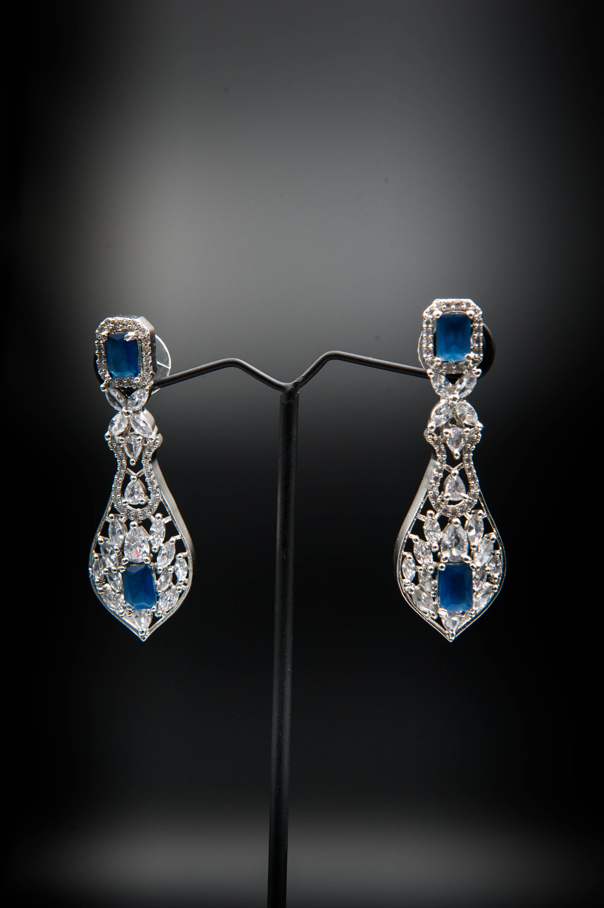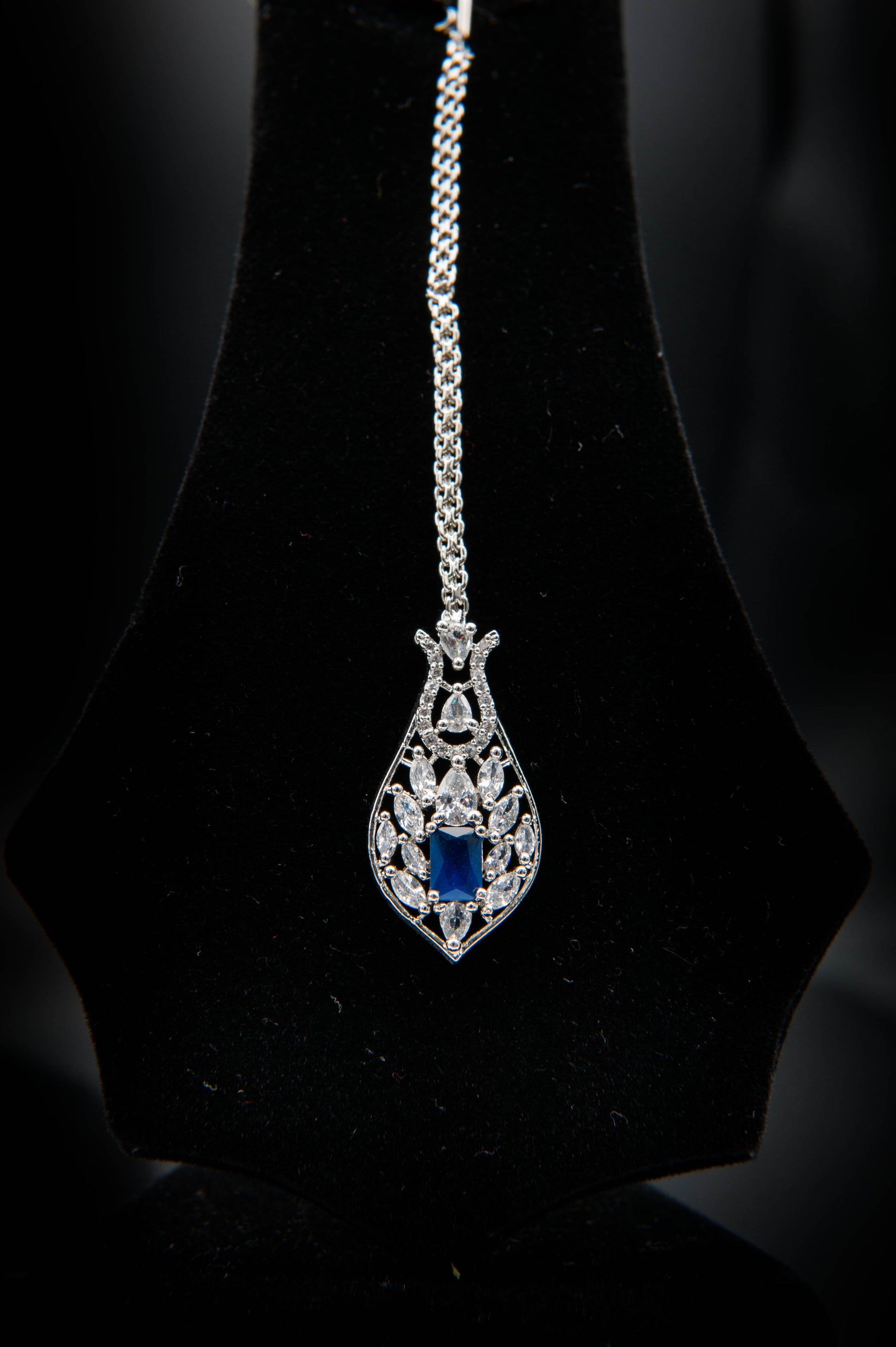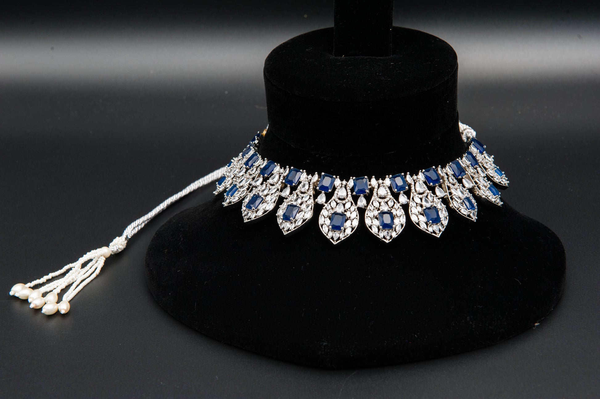 A regal composition of bold color and intricate silverwork. The choker necklace features alternating large and small blue gemstones, each framed in ornate silver detailing that enhances their brilliance. The earrings and pendant echo this motif, showcasing prominent blue stones with matching embellishments. This set commands attention with its rich hue and stately symmetry perfect for ceremonial wear or high-profile occasions.