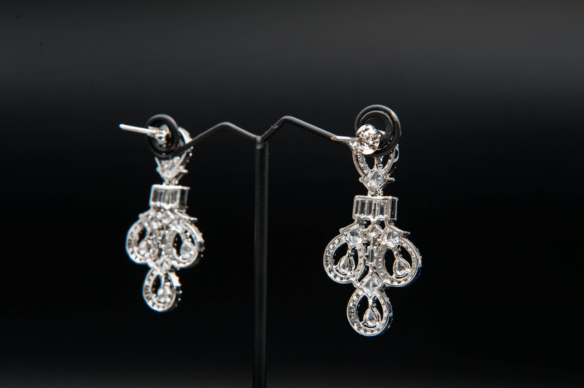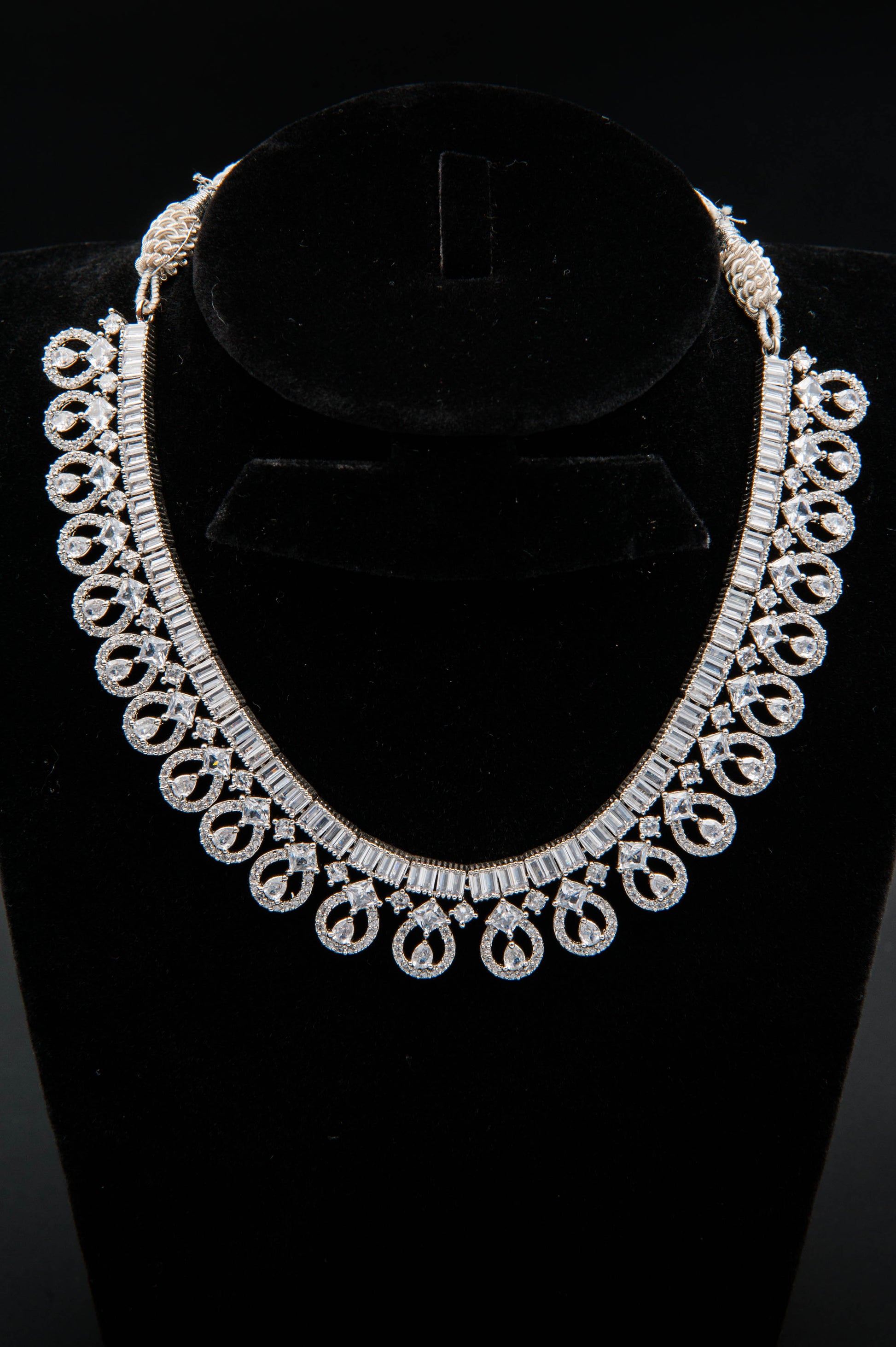 A sleek fusion of classic sparkle and modern geometry. The necklace features a rhythmic interplay of teardrop-shaped elements encrusted with clear stones, linked by baguette-cut accents that add linear elegance. The earrings mirror this composition, balancing vertical symmetry with radiant clarity. This set channels understated luxury—ideal for formal occasions with a contemporary edge.