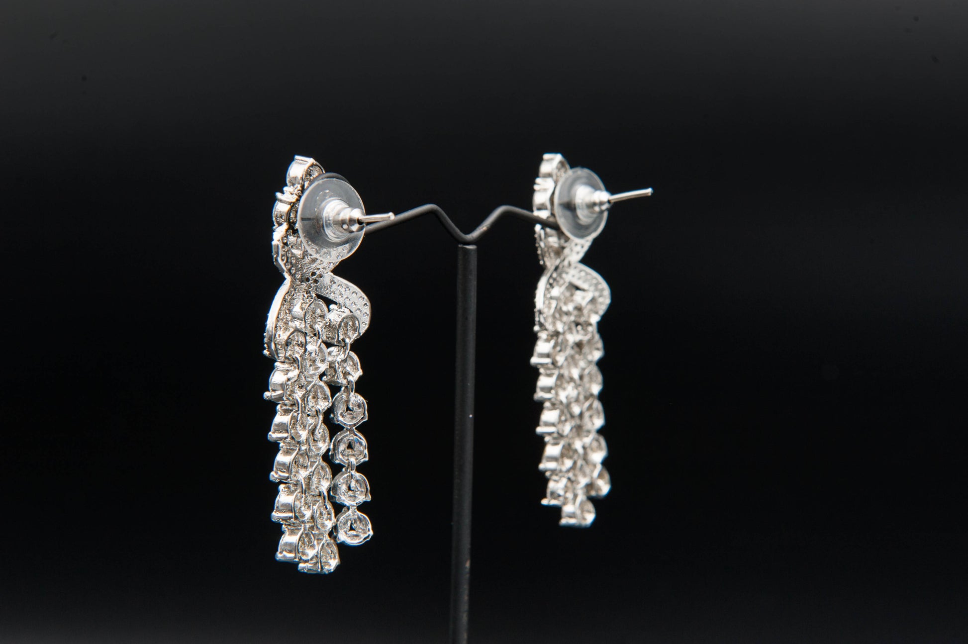A statement of pure sparkle and movement. The choker necklace features layered rows of clear gemstones arranged in a cascading pattern, creating a waterfall effect of brilliance. The earrings echo this motif with looped tops and dangling strands that shimmer with every turn. This set captures the essence of flowing light—ideal for gala nights and spotlight moments.