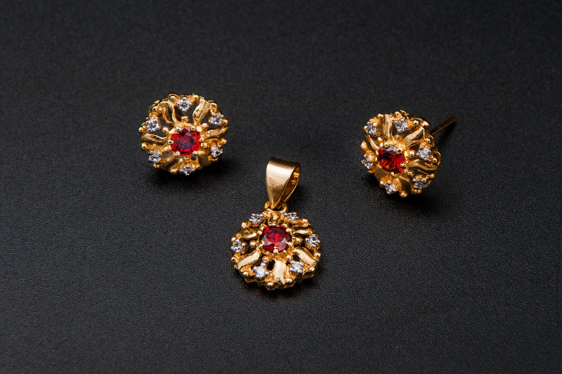 The Crimson Bloom Set features a pendant and matching earrings crafted from 925 sterling silver with 24k gold plating. Each piece showcases a vibrant red gemstone at the center, surrounded by delicate floral motifs encrusted with sparkling white stones. The combination of warm gold tones, radiant red, and shimmering accents creates a timeless look that blends classic beauty with luxurious craftsmanship. Perfect for festive occasions or elegant evenings, this set adds a touch of royal grace to any ensemble.