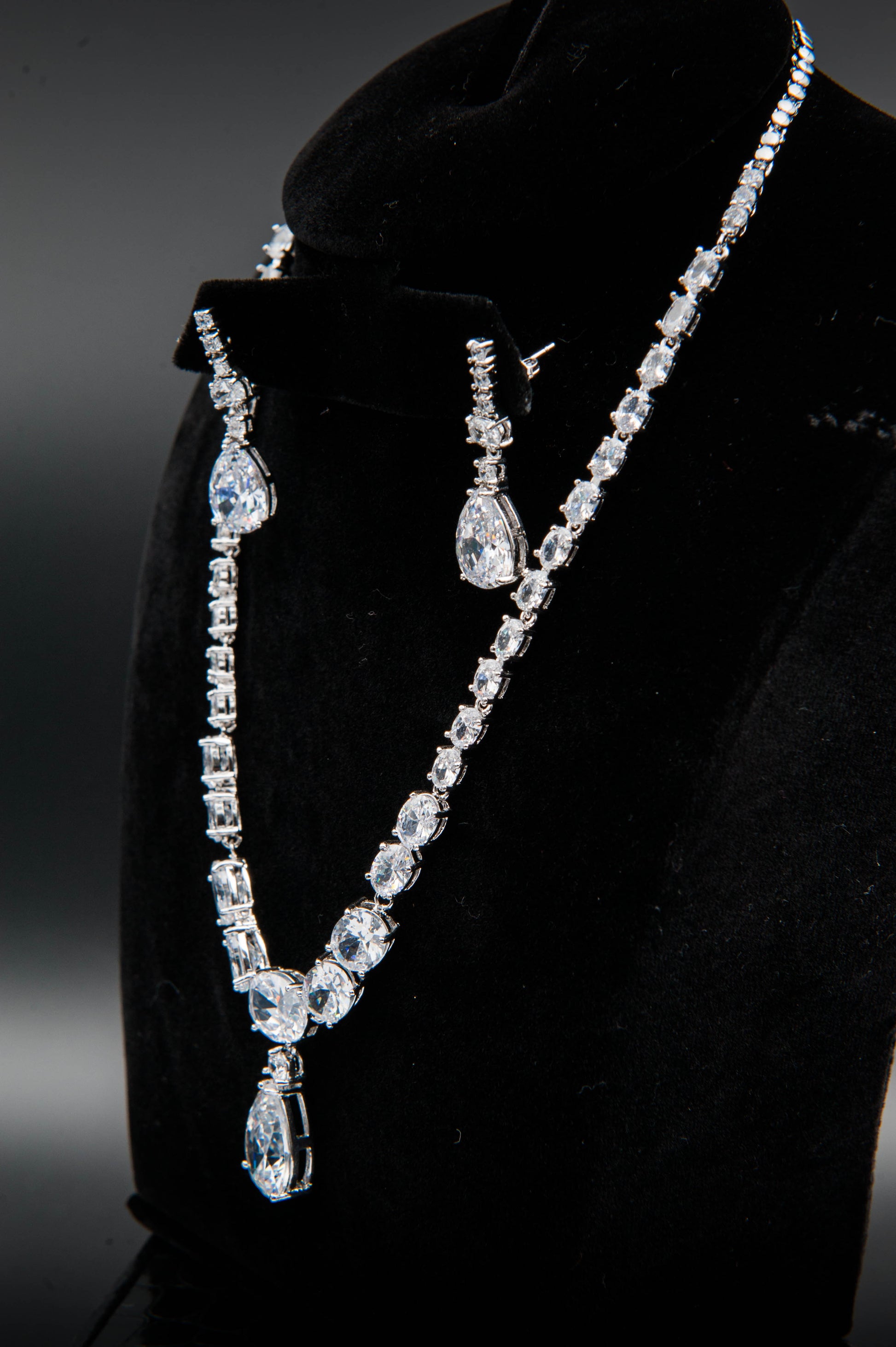 A majestic composition of faceted brilliance. The necklace showcases a regal arrangement of cushion, oval, and round-cut stones, cascading into a commanding teardrop centerpiece that evokes the elegance of a falling crown jewel. The earrings echo this vertical descent, with a trio of stones leading to matching teardrop gems. This set radiates opulence and symmetry ideal for grand entrances and unforgettable evenings.