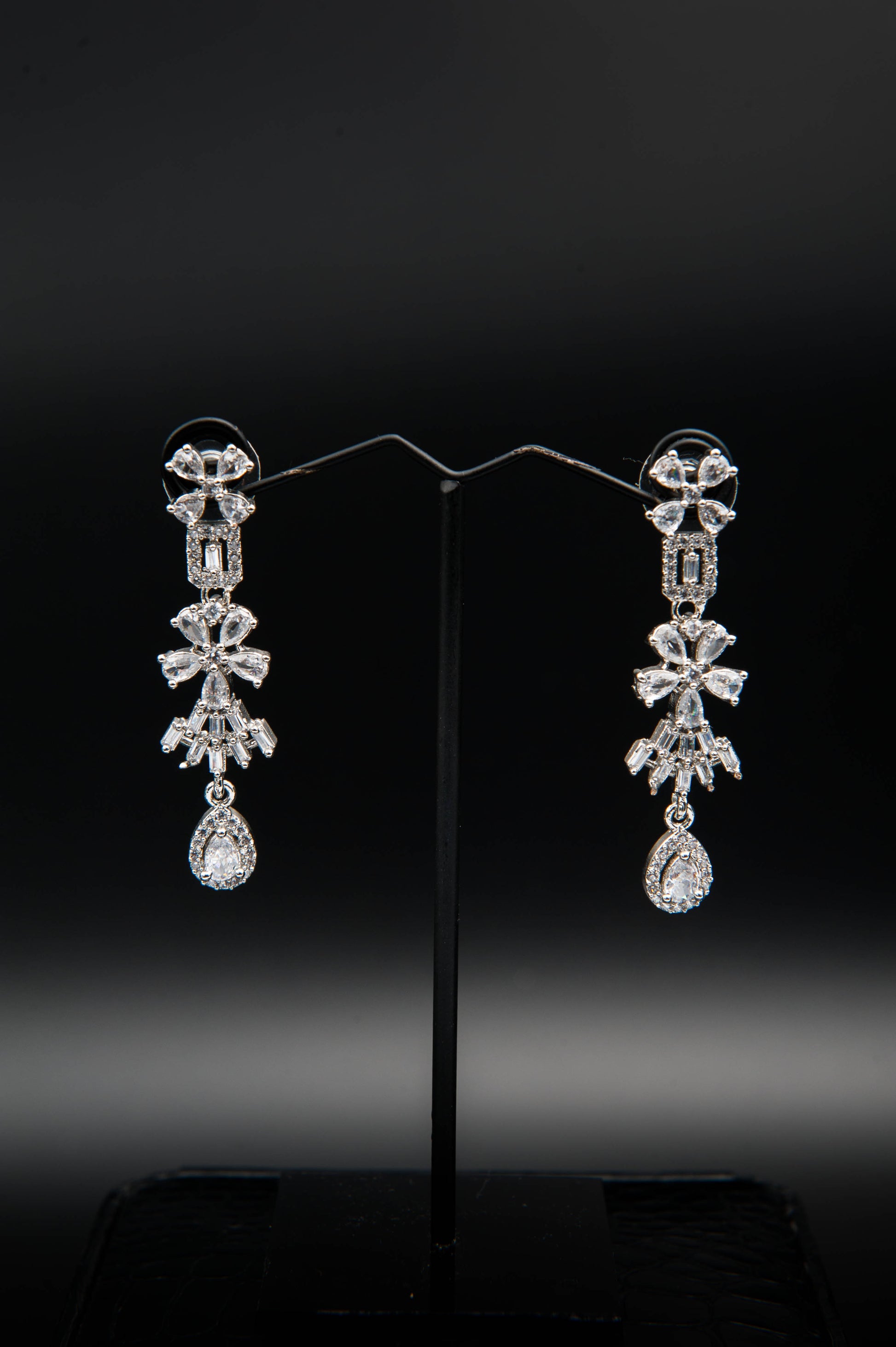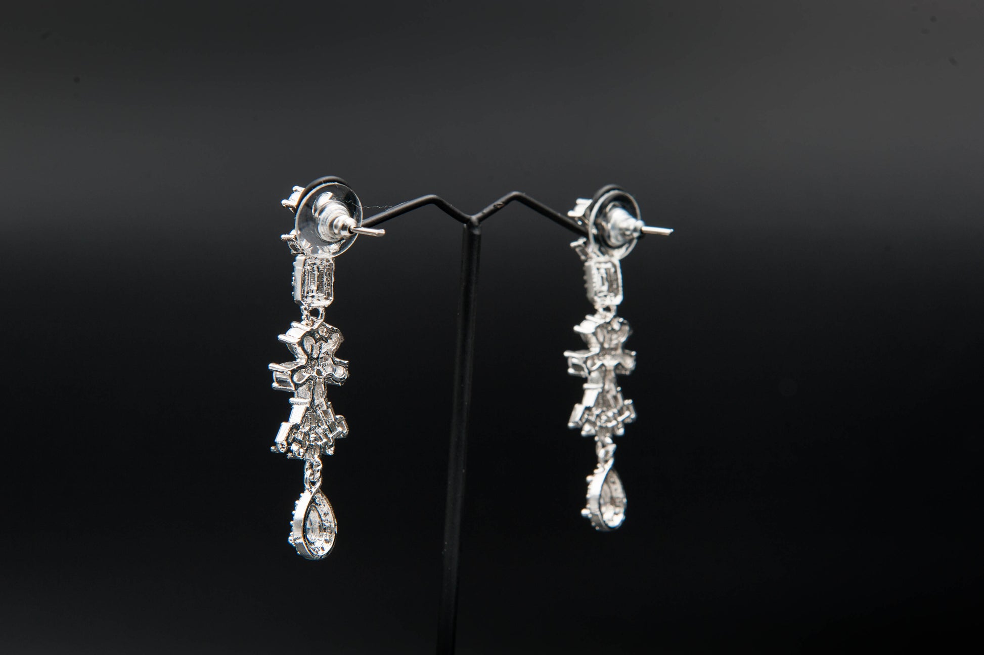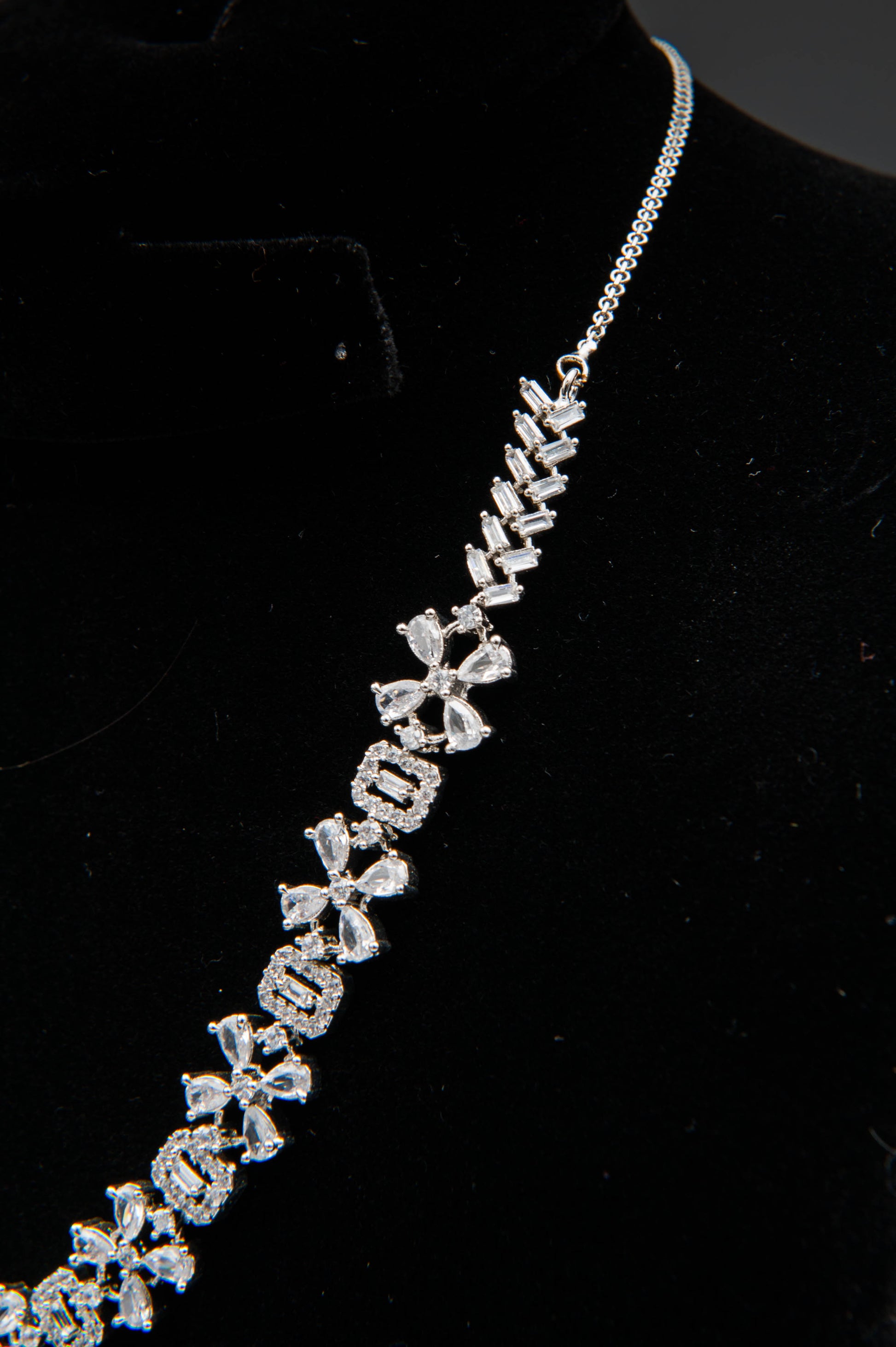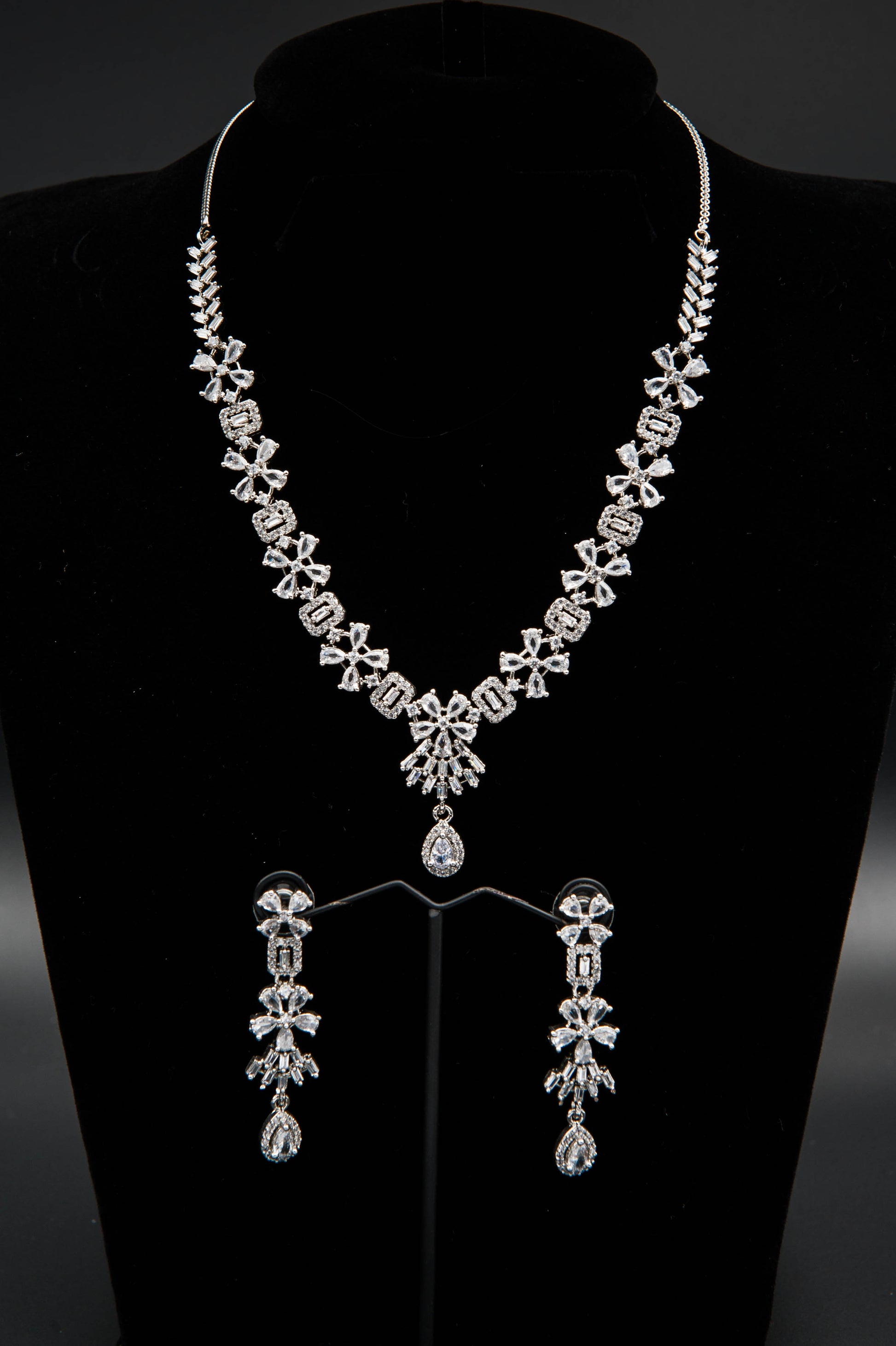 A luminous cascade of symmetry and sparkle. The necklace unfurls in a graceful arc of stone-studded motifs, culminating in a teardrop pendant that anchors the design with quiet drama. The earrings mirror this elegance, each echoing the pendant’s silhouette with matching brilliance. This set evokes the softness of a bridal veil woven in silver light—perfect for moments of poise and celebration.