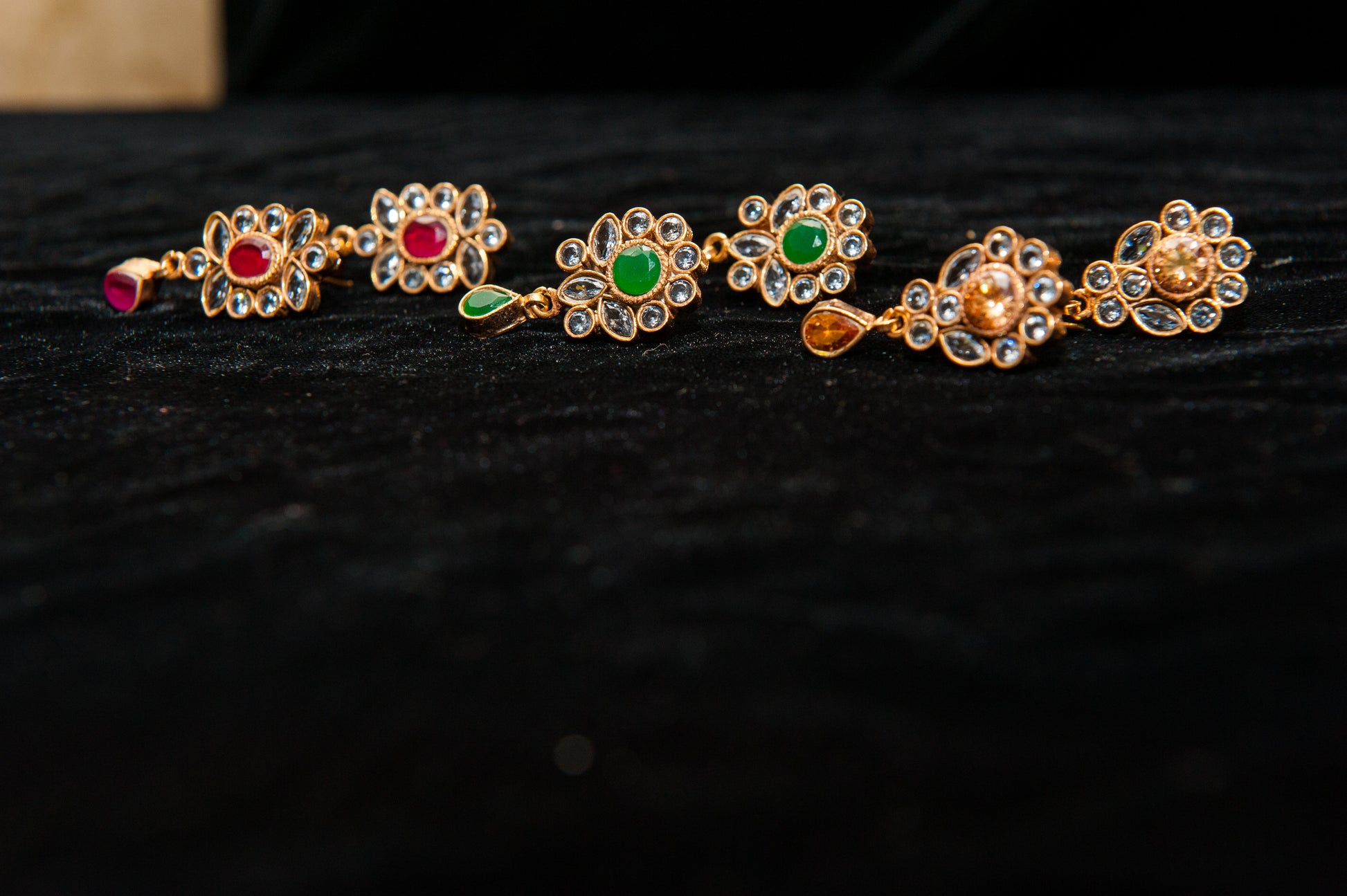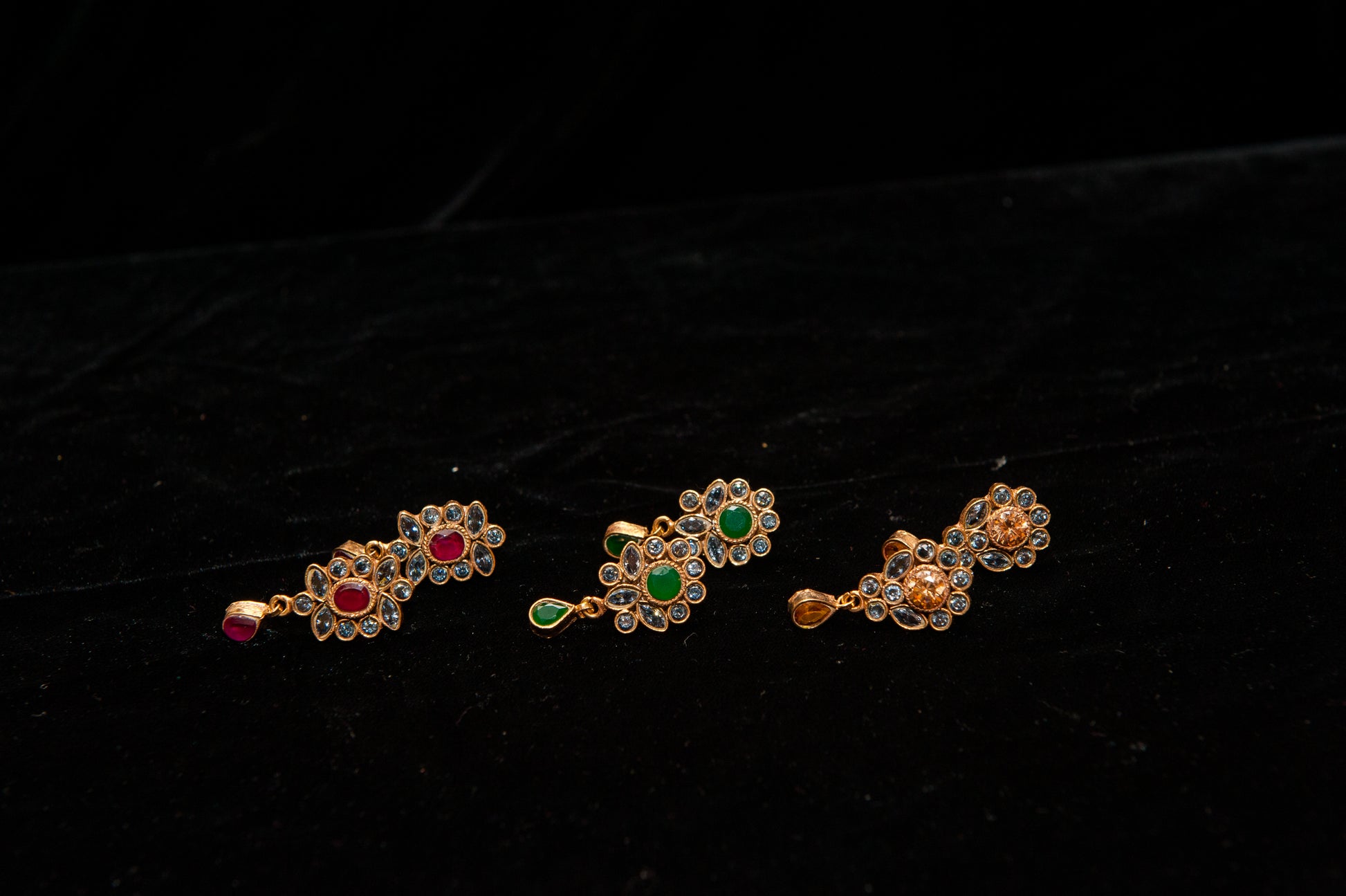A dazzling ensemble of five Kundan earrings, each featuring a central gemstone—ruby, emerald, or amber—encircled by clear stones in a floral motif. Matching teardrop gems dangle below, adding graceful movement and color harmony. Set in ornate gold and styled on velvet, this set celebrates festive elegance and versatile charm, perfect for mixing and matching across occasions.