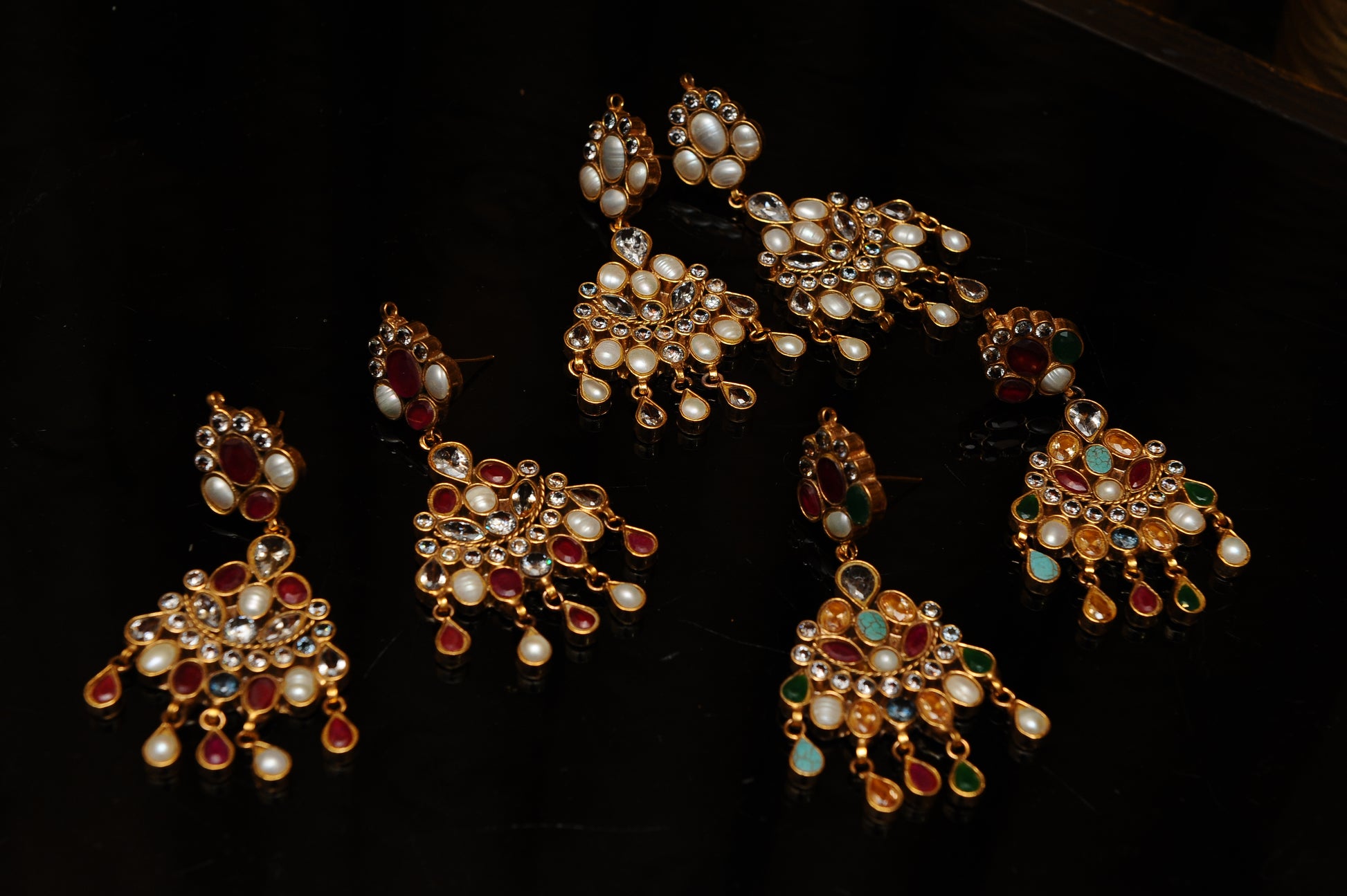 A vibrant set of four Kundan chandelier earrings, each pair showcasing a unique blend of red, green, turquoise, and pearl-white gemstones. Embedded in gold-toned metal and adorned with dangling elements, these earrings exude festive elegance and cultural richness. Their intricate craftsmanship and harmonious palettes make them ideal for bridal styling or celebratory ensembles.