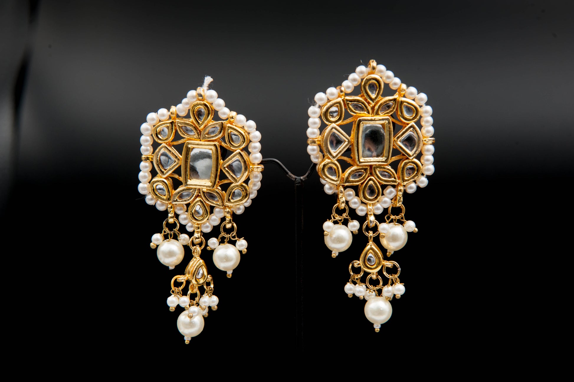 A vision of bridal elegance, Golden Veil features a wide choker and matching earrings crafted in intricate gold filigree and luminous white stones. The choker’s symmetrical design is richly embellished, culminating in a fringe of pearl strands that sway with grace. Each earring echoes the choker’s central motif, with delicate gold detailing and pearl drops that add softness and movement. This set is ideal for weddings and grand celebrations, offering a timeless blend of opulence and refinement.