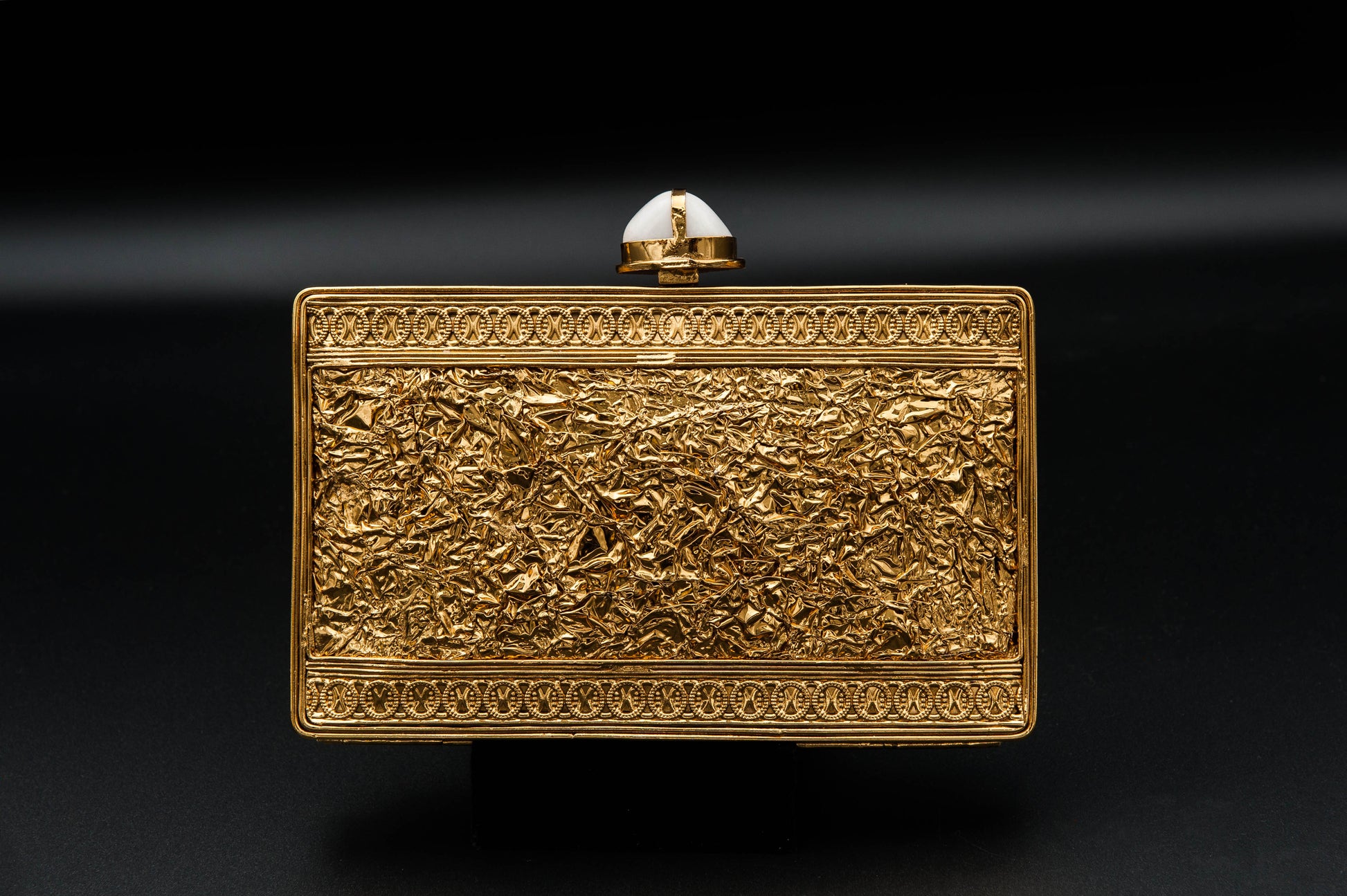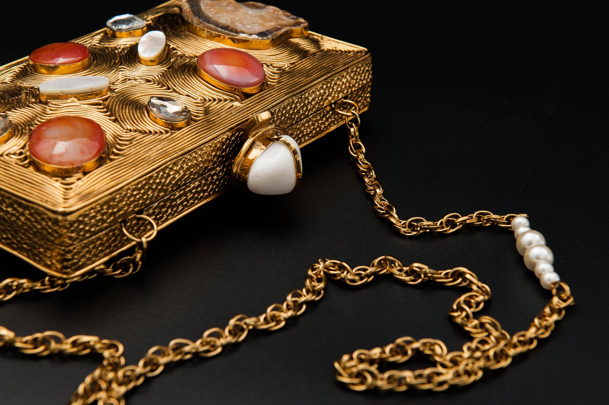 The Heart of the Labyrinth Clutch is a rectangular statement piece wrapped in intricate gold-toned wirework that spirals across the surface like a maze. Embedded within the design are vibrant red-orange stones, luminous mother-of-pearl shards, and clear faceted gems — all leading to a central heart-shaped stone with earthy translucence. The clasp, crowned with a white gem, adds a final touch of elegance. This clutch is perfect for artful evenings, bold styling, or anyone drawn to mystery and magnetism.