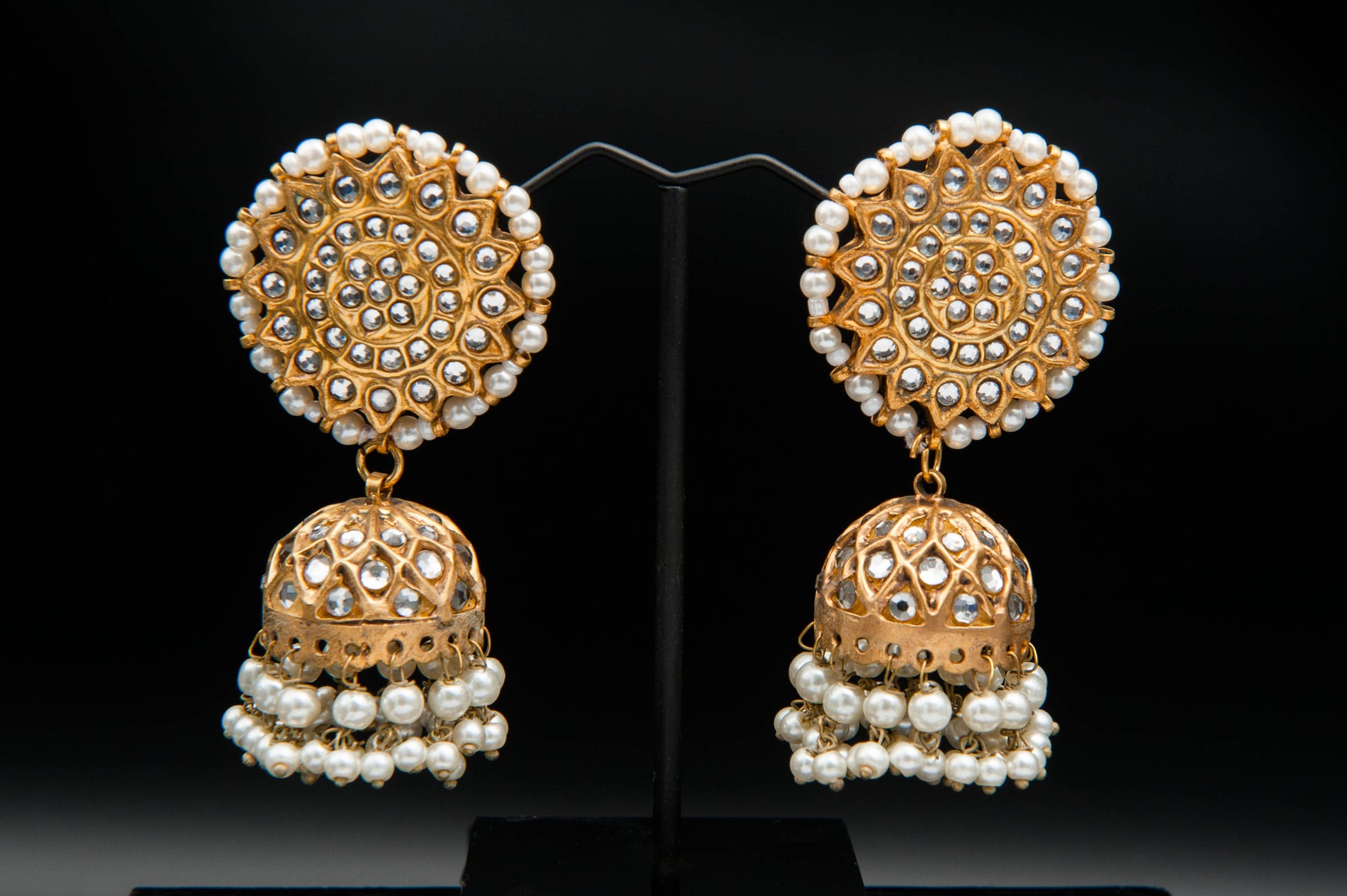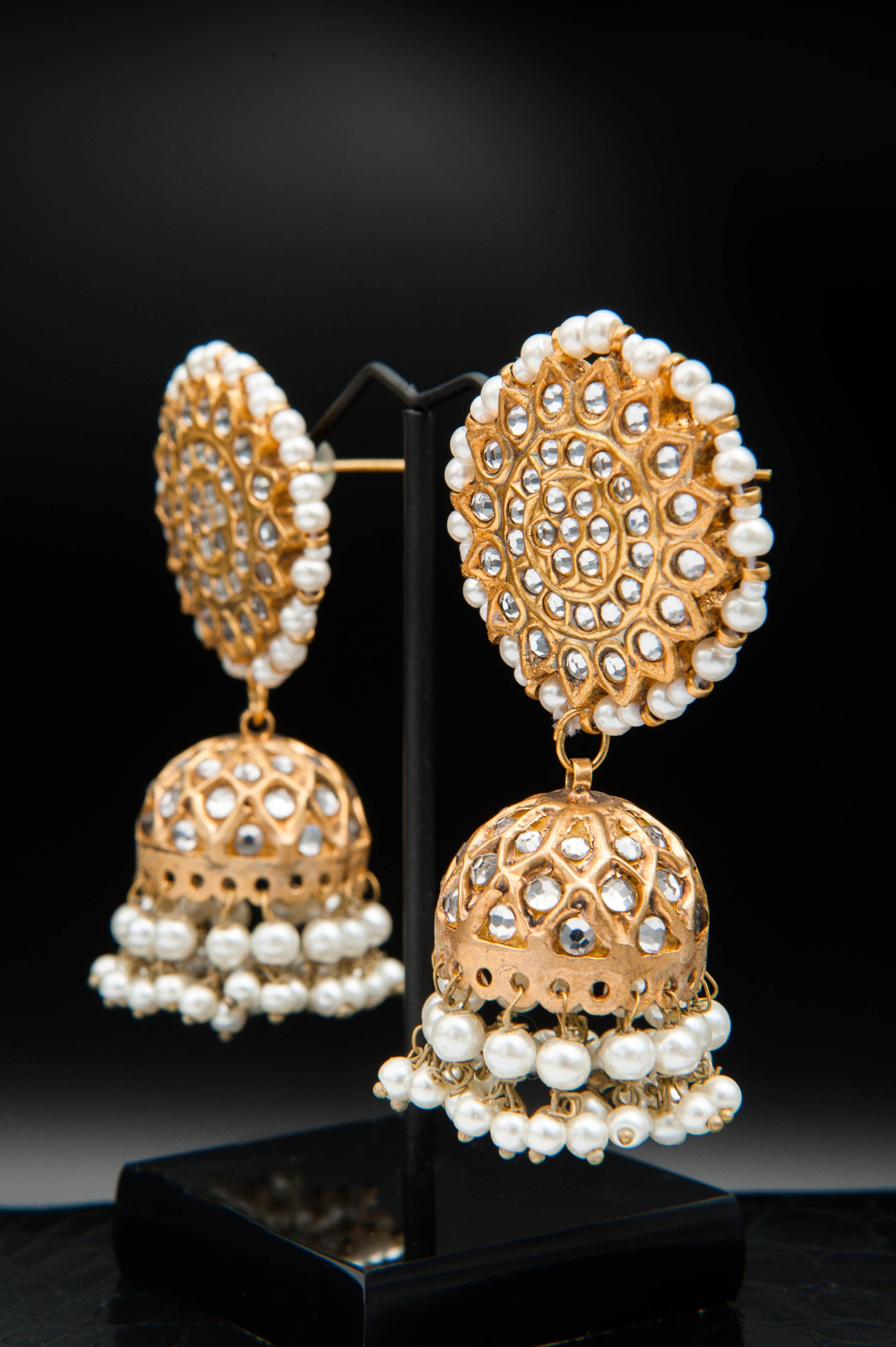 The Ivory Halo Jhumka features a grand circular stud with concentric gold detailing and white stones, bordered by a ring of luminous pearls. Suspended below is a dome-shaped jhumka adorned with a lattice of white stones and finished with cascading pearl strands. Regal and refined, this piece radiates bridal elegance and timeless charm.