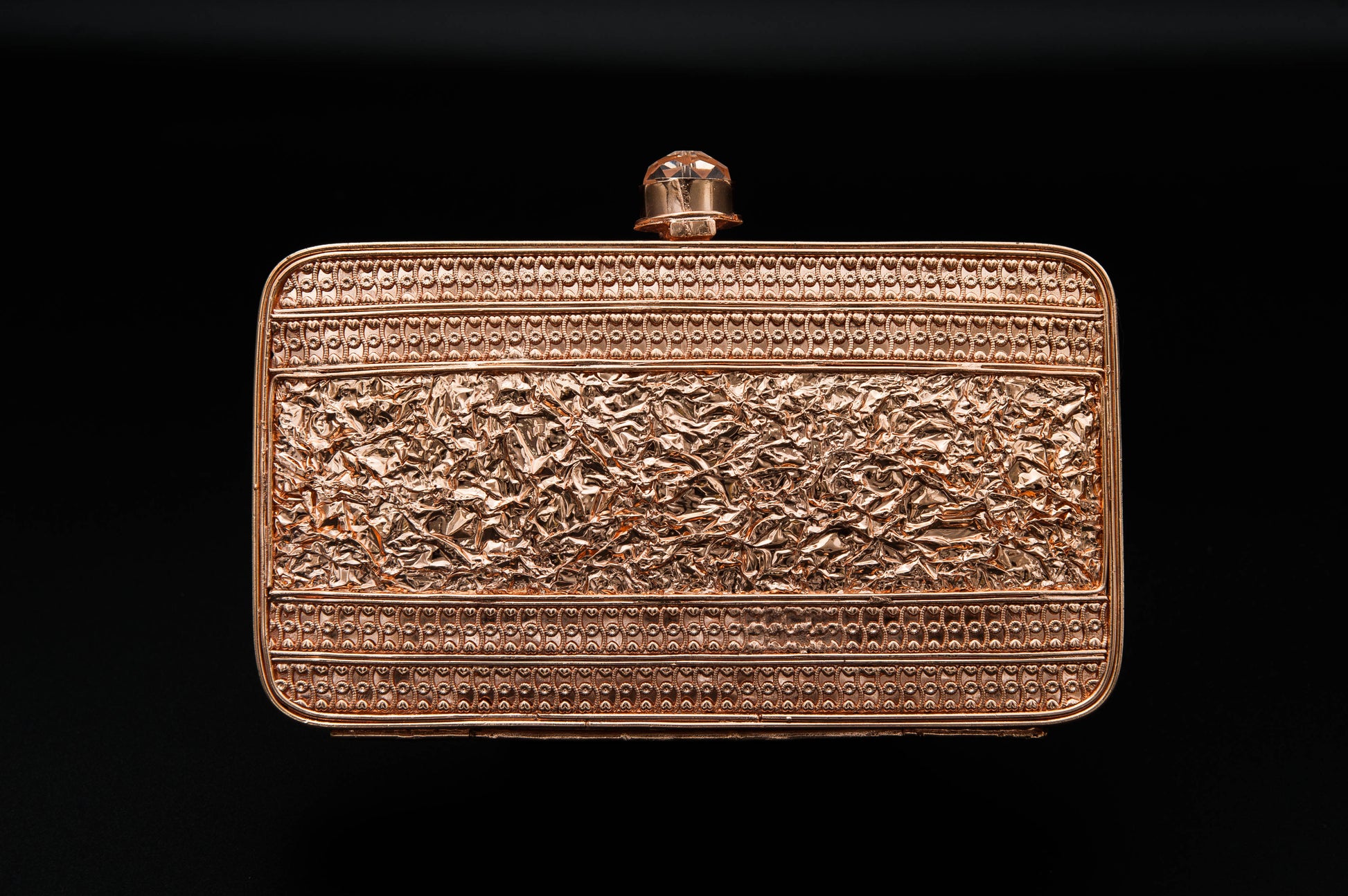 The Lustre Veil Clutch is a rectangular treasure finished in metallic rose gold, featuring a textured surface that catches the light with every movement. At its center, a delicate arrangement of pearls, clear gemstones, and mother-of-pearl fragments adds depth and organic charm. The rose gold chain strap, detailed with wire-wrapped loops, brings a handcrafted feel, while the faceted gem clasp crowns the piece with elegance. Perfect for weddings, formal evenings, or any moment that calls for quiet luxury.