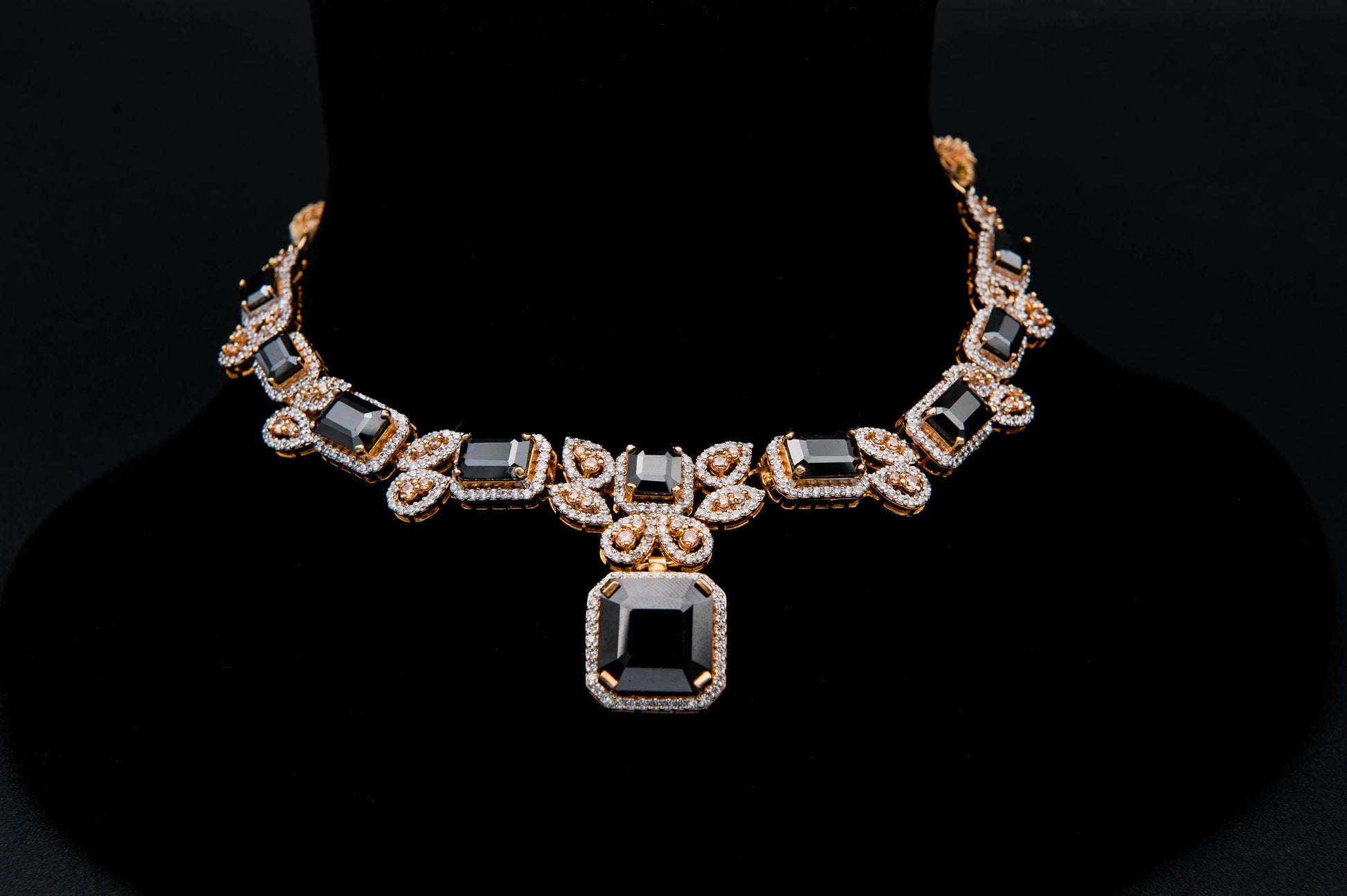 The Midnight Bloom set is a striking fusion of elegance and mystery, featuring a luxurious necklace and matching earrings adorned with bold black gemstones. The necklace showcases rectangular and square-cut black stones framed by shimmering diamonds and intricate gold filigree in floral and leaf motifs. The earrings complement this grandeur with central black gems surrounded by teardrop and circular diamond-studded elements in gold and silver tones. This set is perfect for evening wear or formal occasions, radiating sophistication with a dramatic flair.