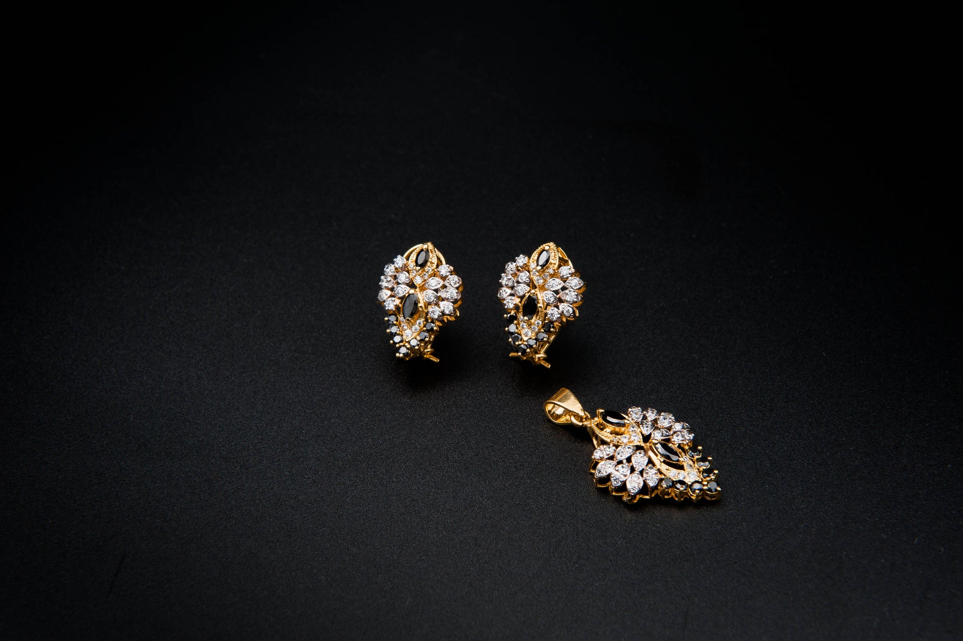 The Midnight Bloom Set features a pendant and matching earrings crafted from 925 sterling silver with 24k gold plating. Each piece showcases a symmetrical floral design, accented with sparkling clear stones and deep black gems that evoke the mystery and allure of night. The intricate gold metalwork adds warmth and luxury, making this set perfect for evening wear, formal occasions, or adding a touch of drama to everyday style. A striking blend of contrast and craftsmanship, it’s made to captivate.