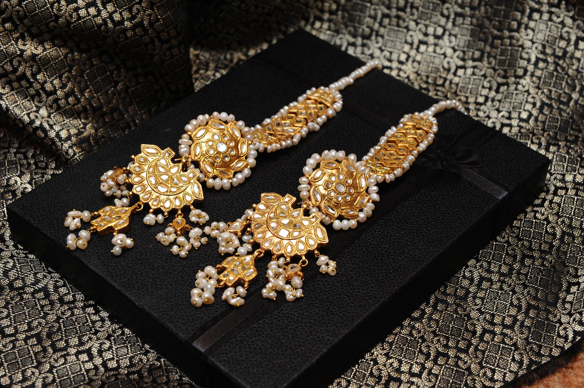 An opulent Kundan jewelry ensemble featuring a gold-toned lattice necklace and matching earrings, each adorned with clear stones and cascading white pearls. The necklace showcases a central floral motif framed by symmetrical patterns and dangling pearl clusters, while the earrings echo the design with crescent accents and layered pearl drops. This set radiates bridal grandeur—ideal for weddings or ceremonial occasions steeped in tradition.