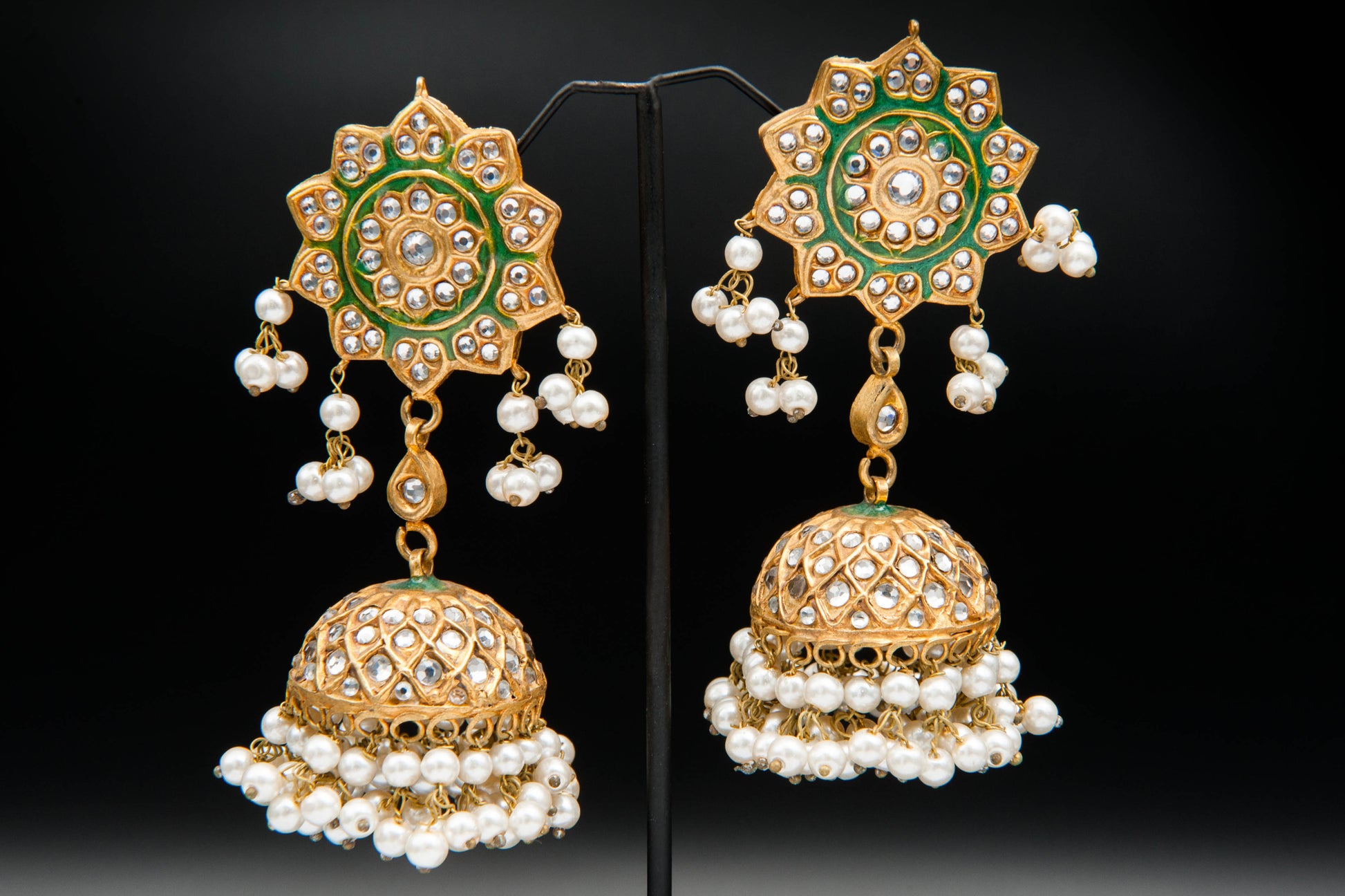 The Pearl Bloom Jhumka features a floral crown with green enamel and white stones, cascading into delicate pearl clusters suspended on golden chains. Below, a dome-shaped jhumka sparkles with a lattice of white stones and a fringe of luminous pearls. Graceful and intricate, this piece captures the charm of garden-inspired elegance with traditional richness.