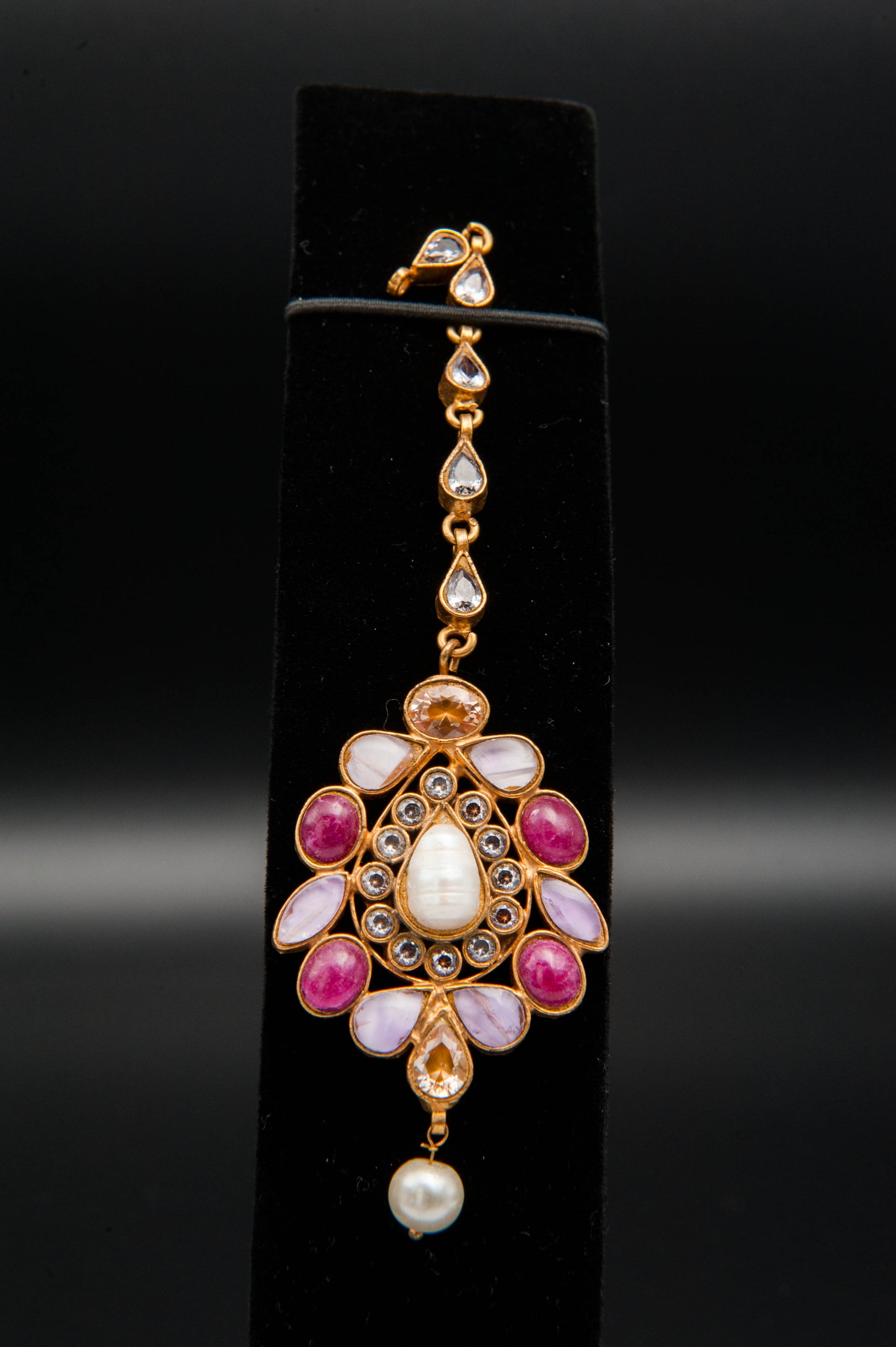 A harmonious trio of necklace, earrings, and bracelet, Rose Radiance celebrates the grace of magenta and pearl. The necklace showcases a symmetrical cascade of teardrop and round stones, anchored by a central pendant that glows with white brilliance and rose-toned allure. Matching earrings mirror the pendant’s design, each adorned with delicate pearl drops that sway with movement. The bracelet completes the ensemble with a refined echo of the motif, featuring a central flourish and a graceful chain of stones. Ideal for bridal wear or festive occasions, this set exudes timeless charm and ceremonial elegance.