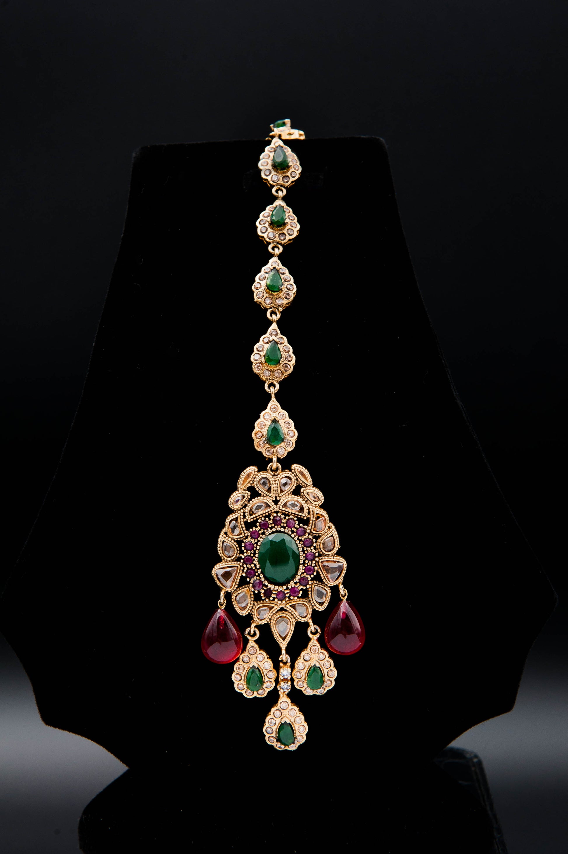 The Royal Enchantment set captures the essence of regal splendor with a traditional choker necklace, ornate earrings, and a matching pendant or maang tikka. The choker dazzles with gold filigree, green and white stones, and dangling red beads, while the earrings echo this palette with symmetrical arrangements of green, red, and white gemstones in elaborate gold settings. Completing the ensemble, the pendant features a cascading design of green stones and a central floral motif, adorned with vibrant red and green drops. This set is ideal for bridal wear or festive occasions, radiating cultural richness and timeless elegance.
