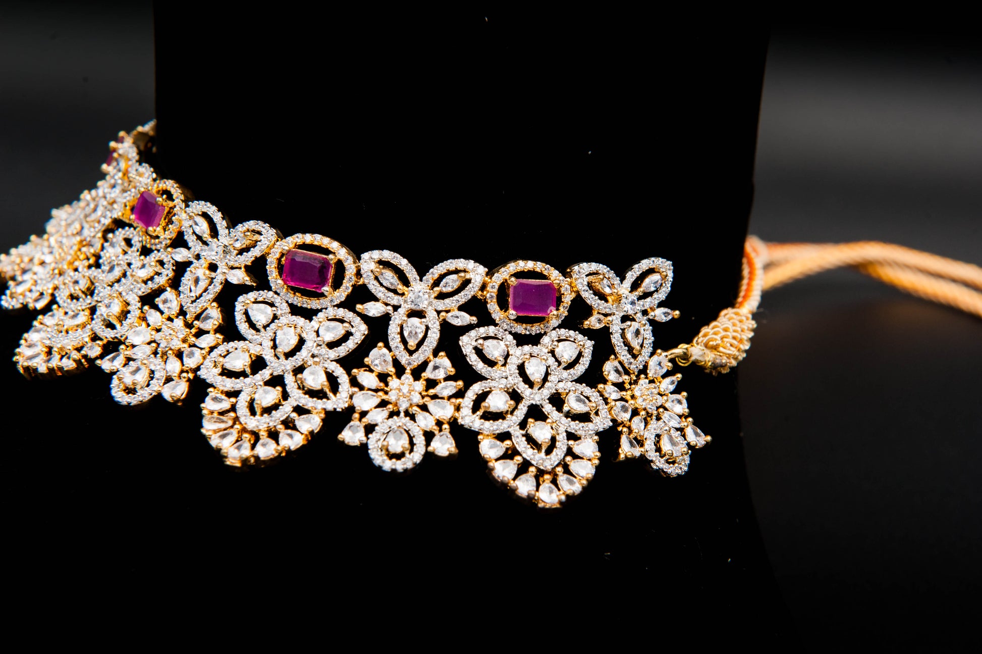A lavish blend of tradition and jewel-toned elegance. The choker necklace blooms with intricate goldwork and embedded white stones, crowned by rich purple gemstones that evoke the depth of royal orchids. Matching earrings and a maang tikka complete the ensemble, each echoing the floral symmetry and gemstone brilliance. This set radiates bridal opulence perfect for ceremonial grandeur and unforgettable entrances.