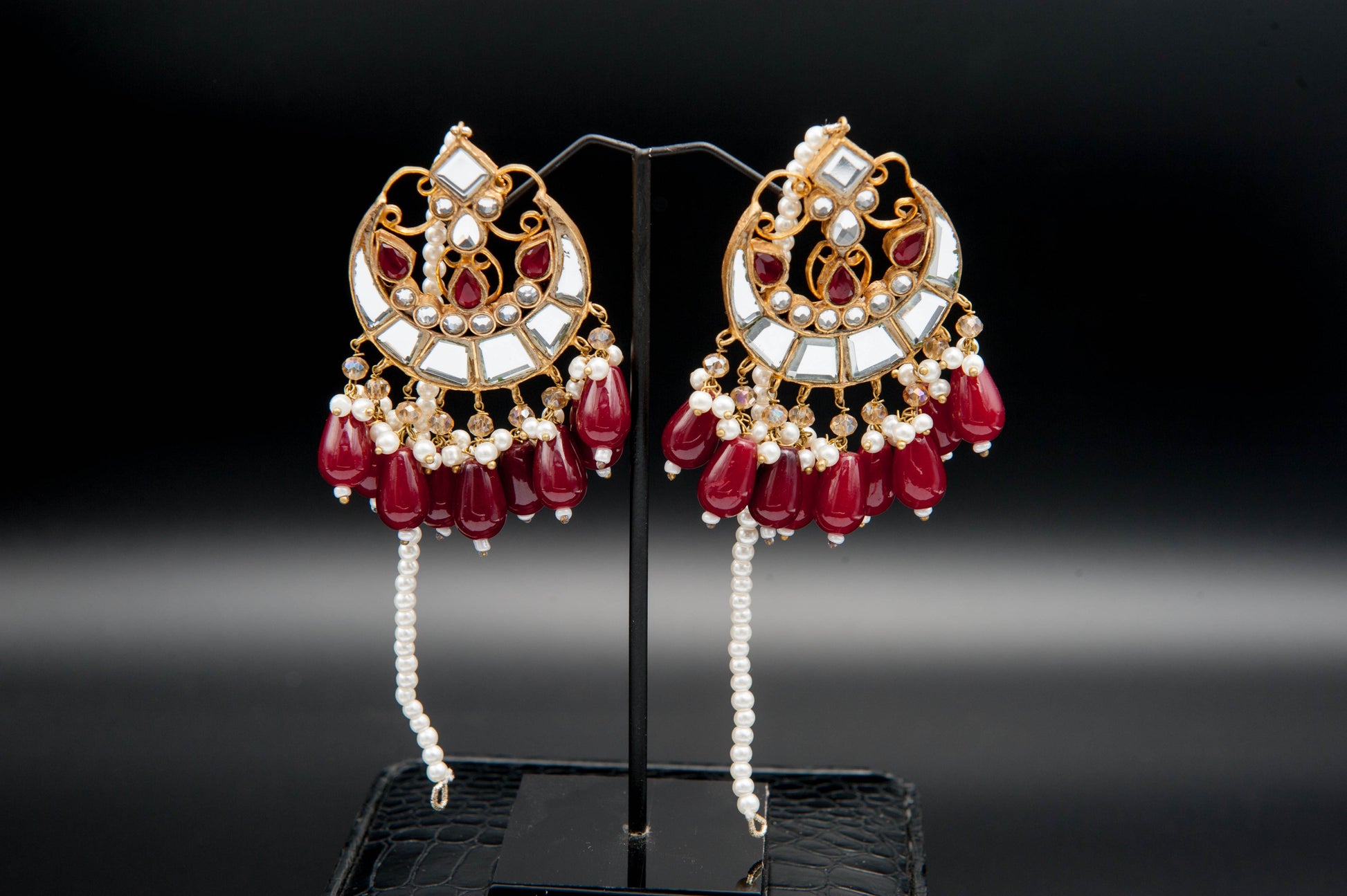 Regal Crimson Heirloom is a majestic bridal collection that unites layered pearl opulence with intricate gold craftsmanship. The centerpiece is a cascading necklace of luminous white pearls, adorned with red enamel pendants and delicate pearl clusters, radiating timeless grandeur. Complementing this are a choker, earrings, maang tikka, and haath phool, each echoing the same palette of gold, white stones, and deep crimson beads. Together, the ensemble embodies ceremonial splendor—balancing symmetry, richness, and heritage in a complete heirloom set designed for the most regal occasions.