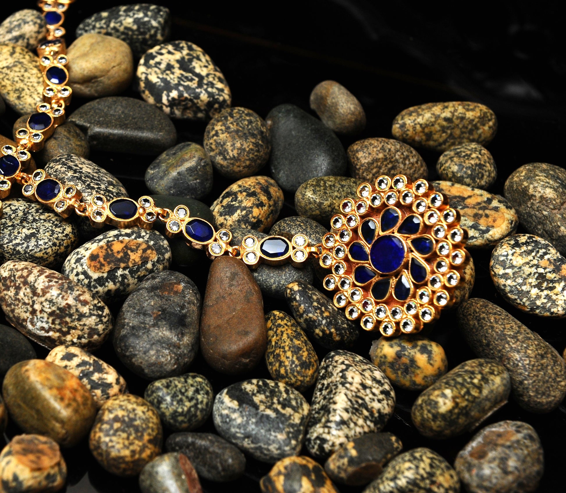 A striking Kundan necklace featuring a circular floral pendant composed of rich sapphire-toned stones, framed by clear crystals in a gold-toned setting. The chain continues the motif with alternating blue and clear stones, creating a harmonious and regal flow. Styled against natural pebbles, this piece evokes elegance and depth—ideal for bridal wear or evening ceremonial attire.