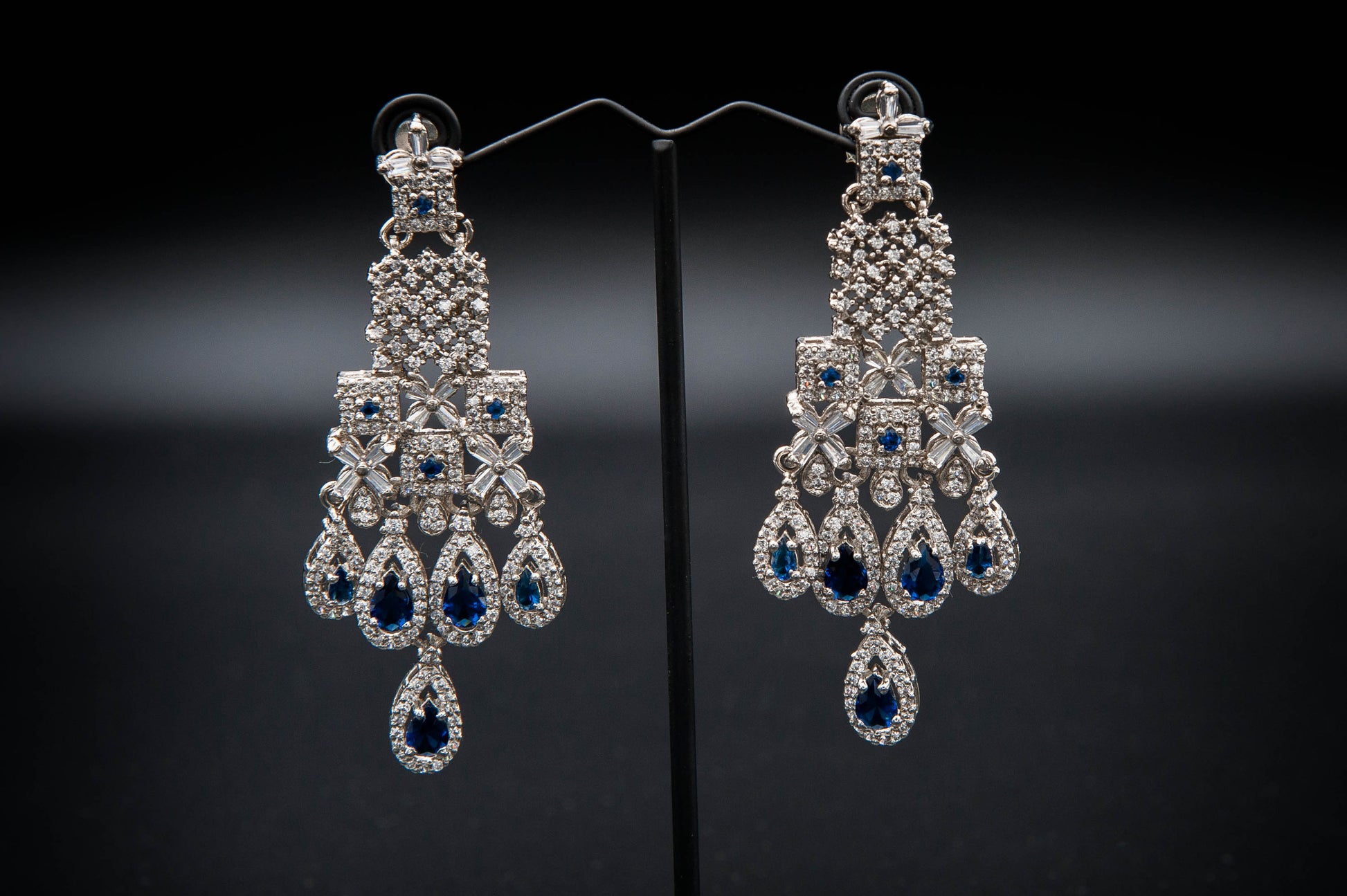 The Sapphire Cascade Bridal Set is a regal creation in silver-toned metal, designed to dazzle with its intricate craftsmanship and luminous beauty. The choker necklace features a dense band of sparkling white stones, accented with square and floral motifs adorned with deep blue gems, and finished with cascading sapphire teardrop pendants. Complementing the necklace, the chandelier earrings showcase floral and geometric silverwork, each set with multiple sapphire teardrops framed in halos of clear stones. Together, this ensemble embodies timeless elegance with a bold jewel-toned twist, perfect for brides seeking sophistication and grandeur on their special day.
