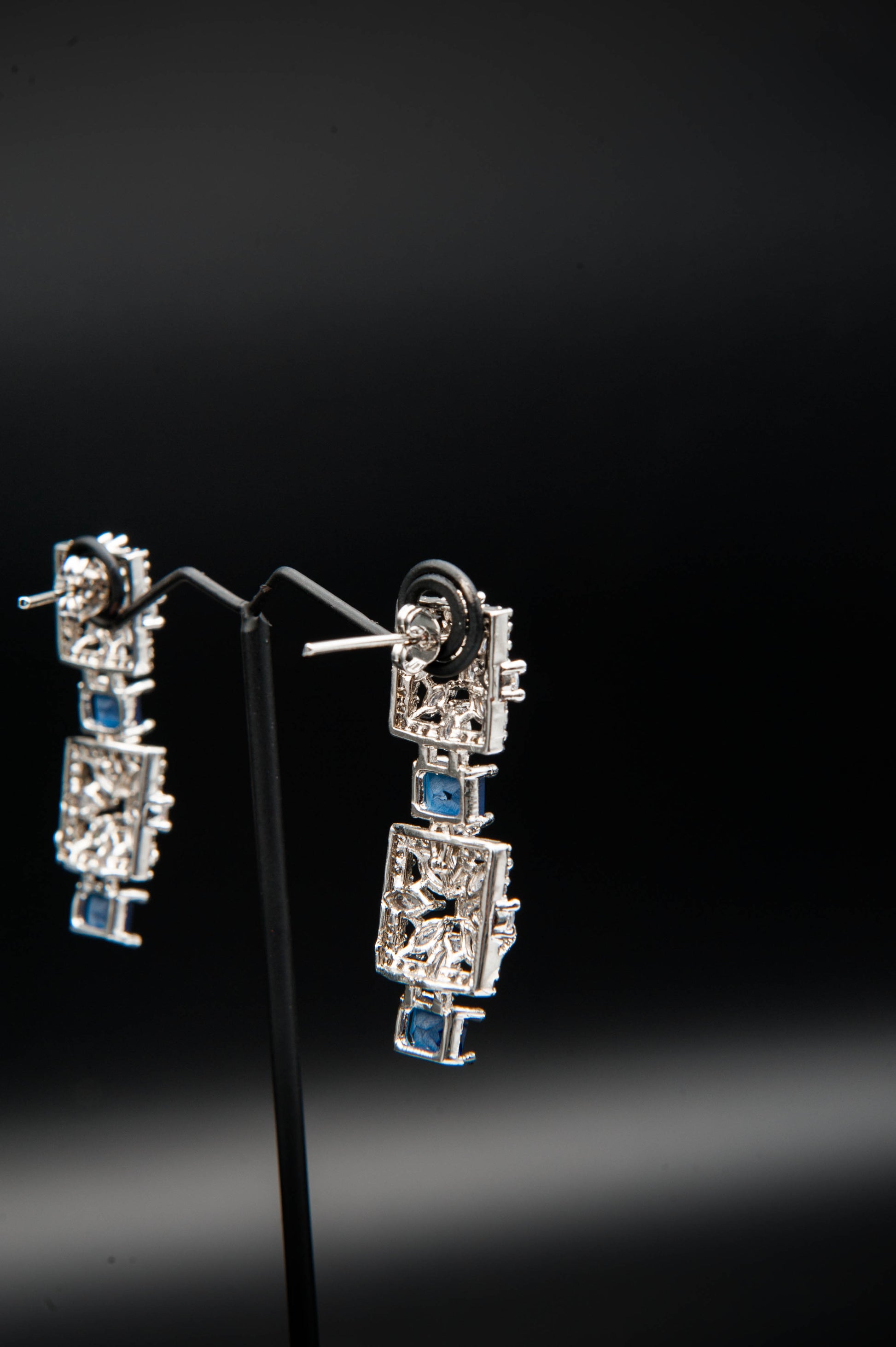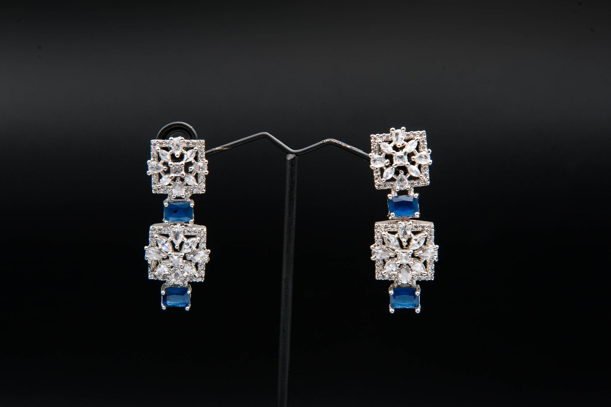 A bold interplay of structure and hue. The necklace features alternating square silver elements with intricate stonework, interspersed with deep blue rectangular gemstones that evoke the richness of sapphires. The earrings echo this architectural rhythm, pairing silver squares with matching blue accents. This set blends geometric precision with regal color—ideal for formal occasions that call for confident elegance.