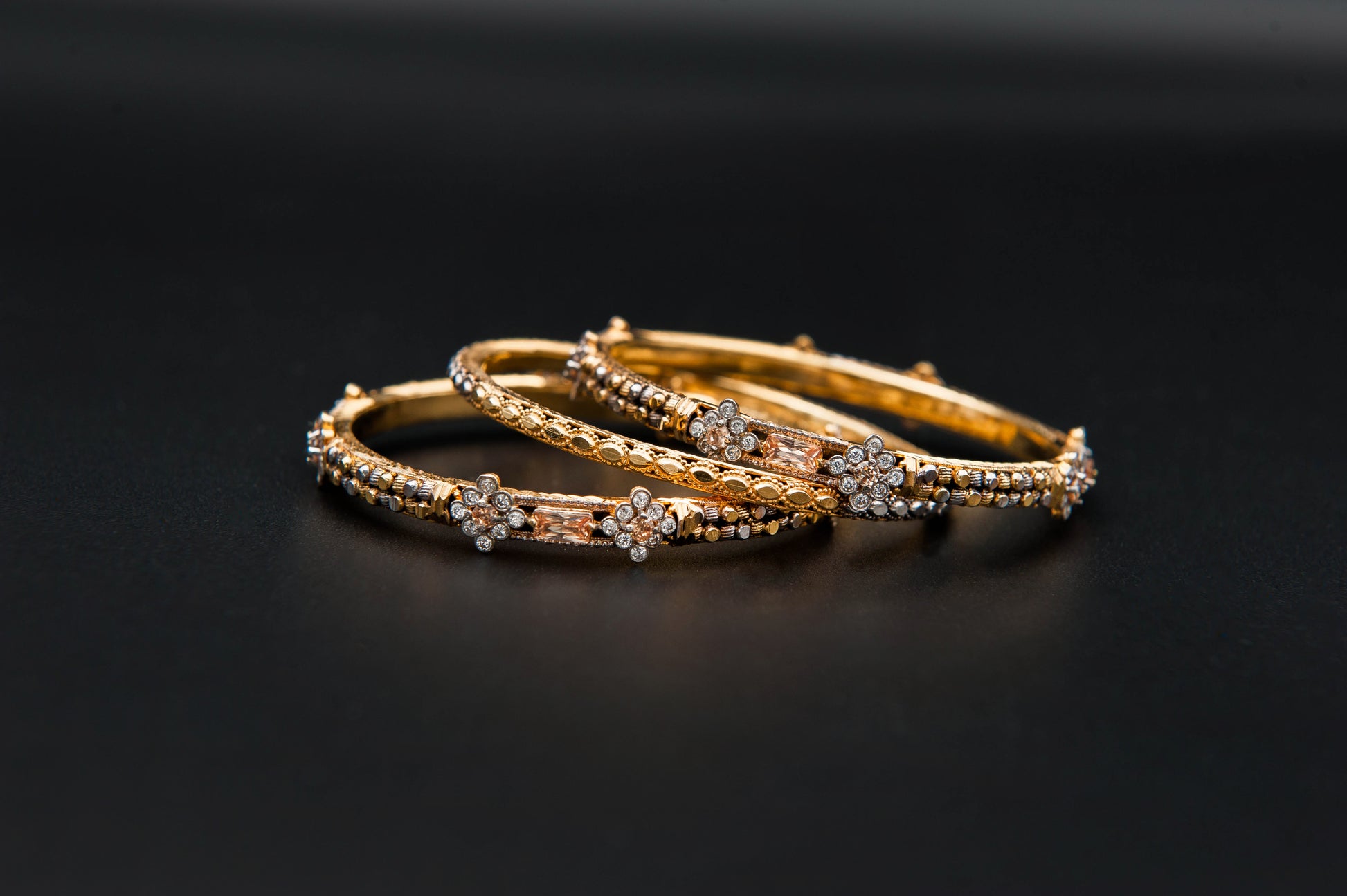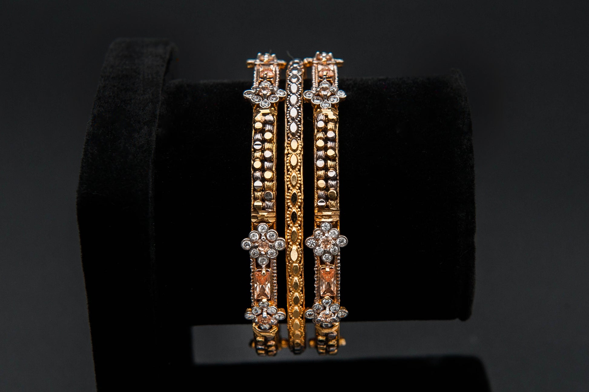 The Peach Bloom Bangles celebrate traditional artistry with a vibrant twist. Crafted in 925 sterling silver and enriched with 24K gold plating, each bangle features intricate floral motifs formed from white stones and rectangular peach-colored accents. Textured detailing and raised dot patterns add depth and dimension, while the dual-tone finish enhances their ceremonial elegance. Perfect for festive occasions or cultural celebrations, these bangles blend heritage charm with radiant sophistication.