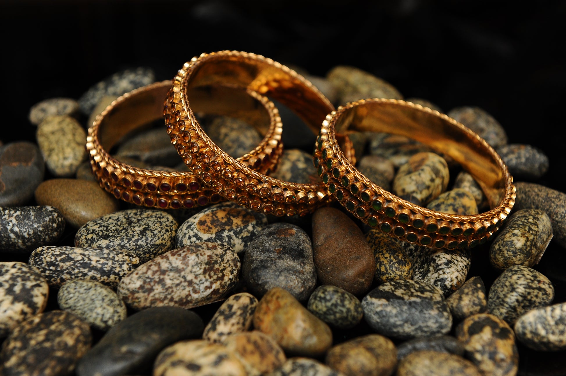 A harmonious set of three Kundan bangles, each distinguished by its gemstone hue—ruby red, emerald green, and champagne crystal. Crafted in ornate gold with textured detailing, they offer a versatile blend of tradition and radiance. Worn together, they create a layered symphony of color; worn individually, each bangle stands as a refined accent.