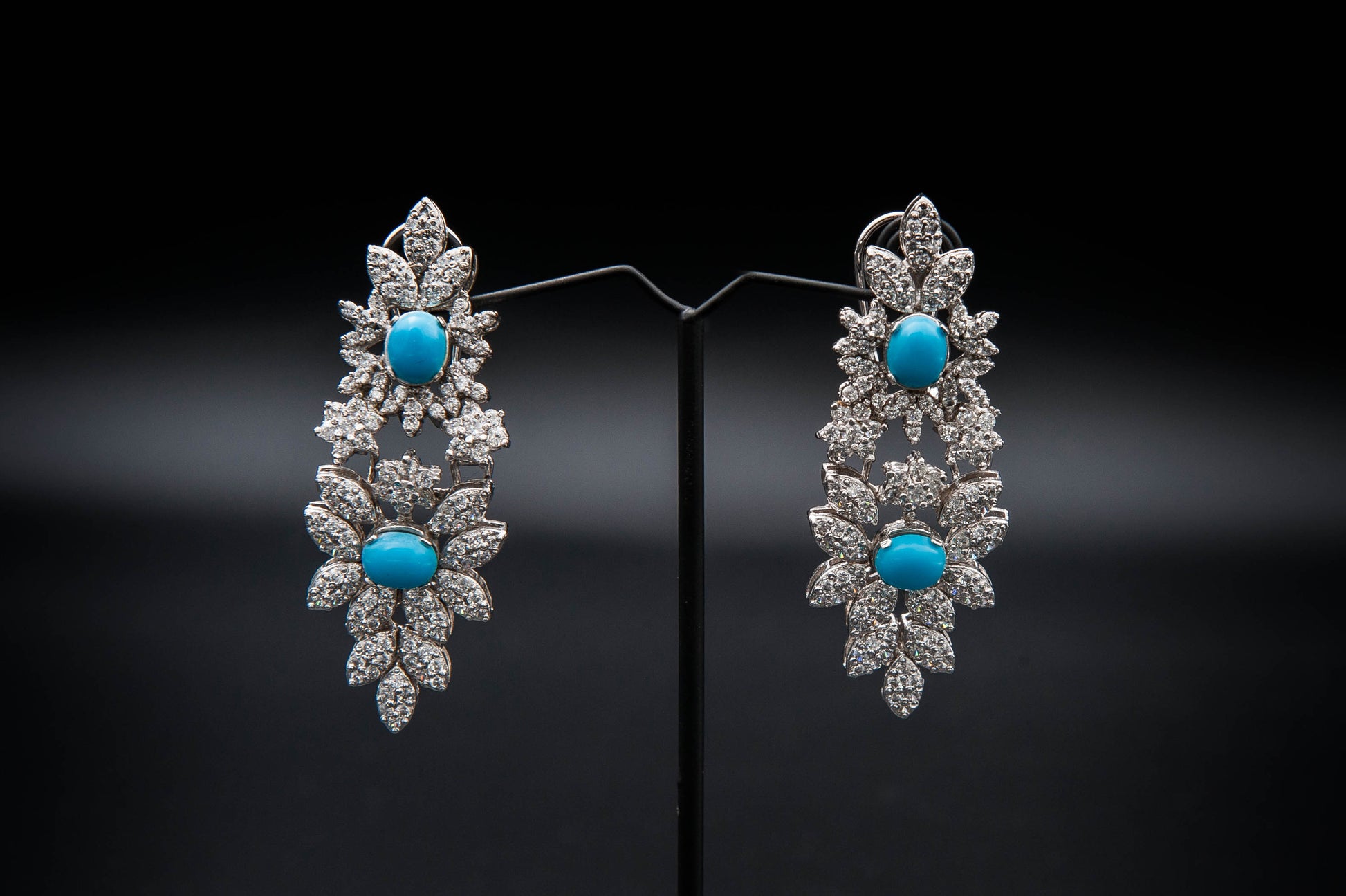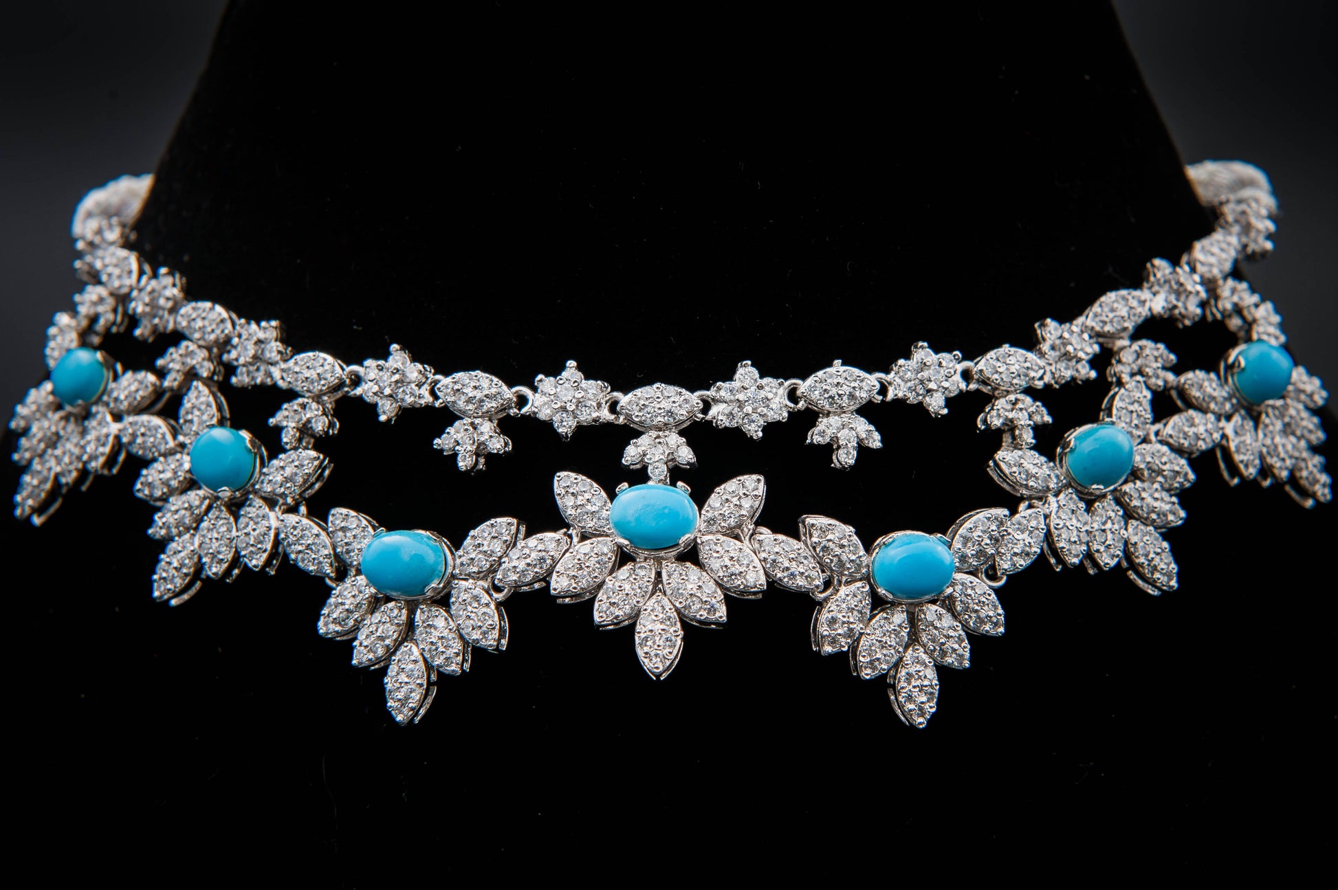 The Turquoise Bloom Bridal Set is a radiant creation in silver-toned metal, blending elegance with tradition. The necklace showcases oval turquoise stones framed by marquise-cut diamond-like petals, forming a graceful floral garden across the neckline. Complementing it, the statement earrings feature dual turquoise centers surrounded by petal-like white stones, echoing the necklace’s charm. Unified by shimmering silver and vibrant turquoise, this set offers timeless beauty with a refreshing touch of color and sparkle, making it an exquisite choice for brides who want sophistication with a hint of vibrance.