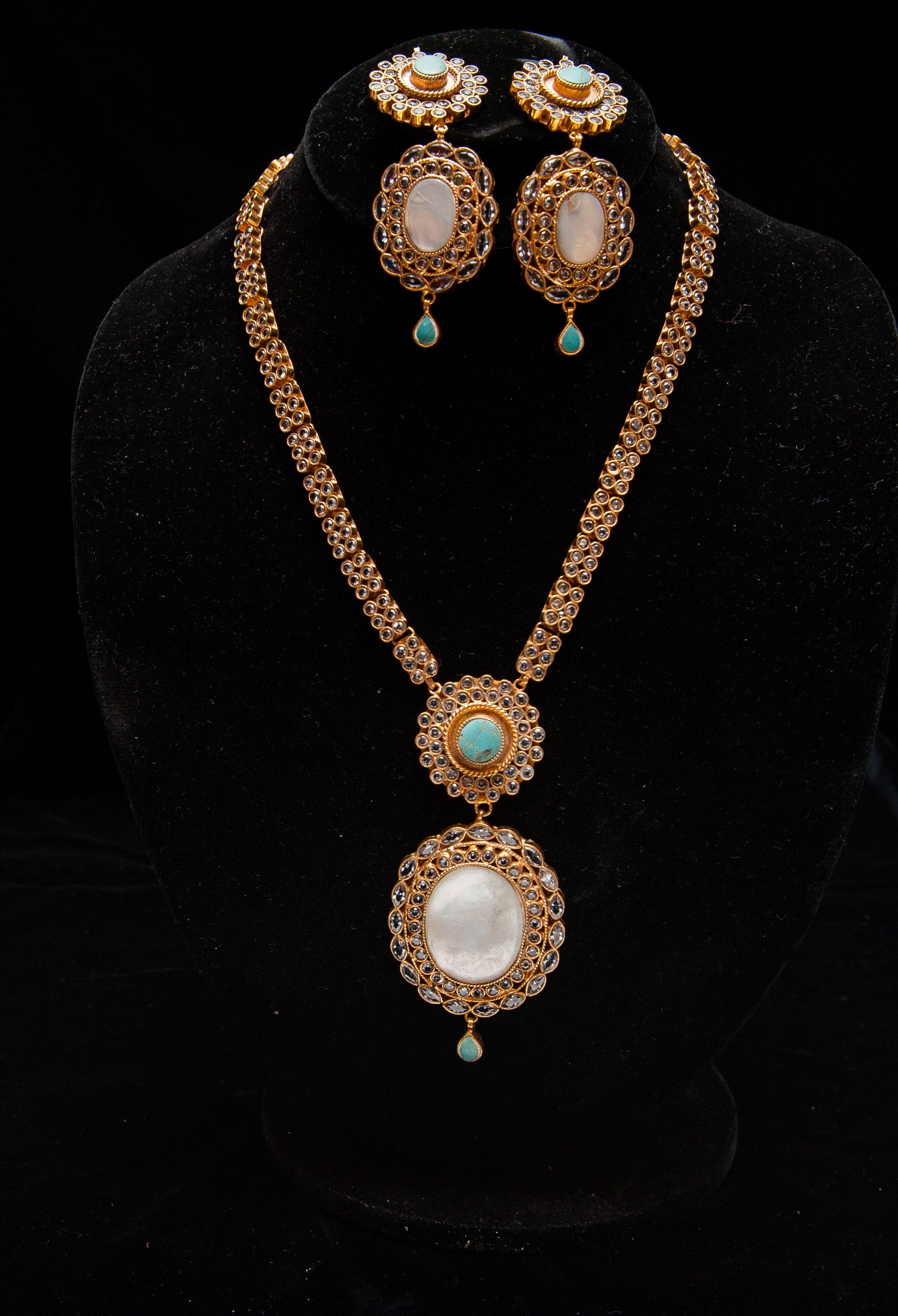 A refined Kundan ensemble featuring a gold filigree necklace with dual pendants—one showcasing a veined turquoise stone, the other a luminous white gem with a turquoise drop. Matching earrings mirror the pendant design, blending white stones with turquoise accents. The additional turquoise studs offer versatile styling. This set evokes vintage charm and serene sophistication, ideal for bridal wear or festive elegance.