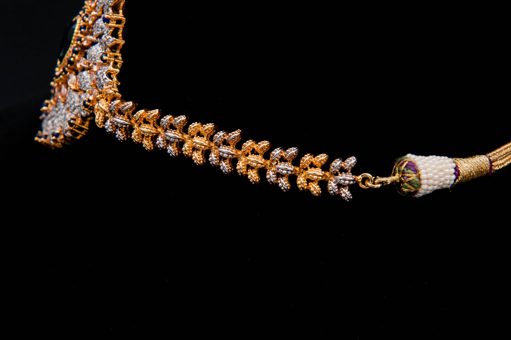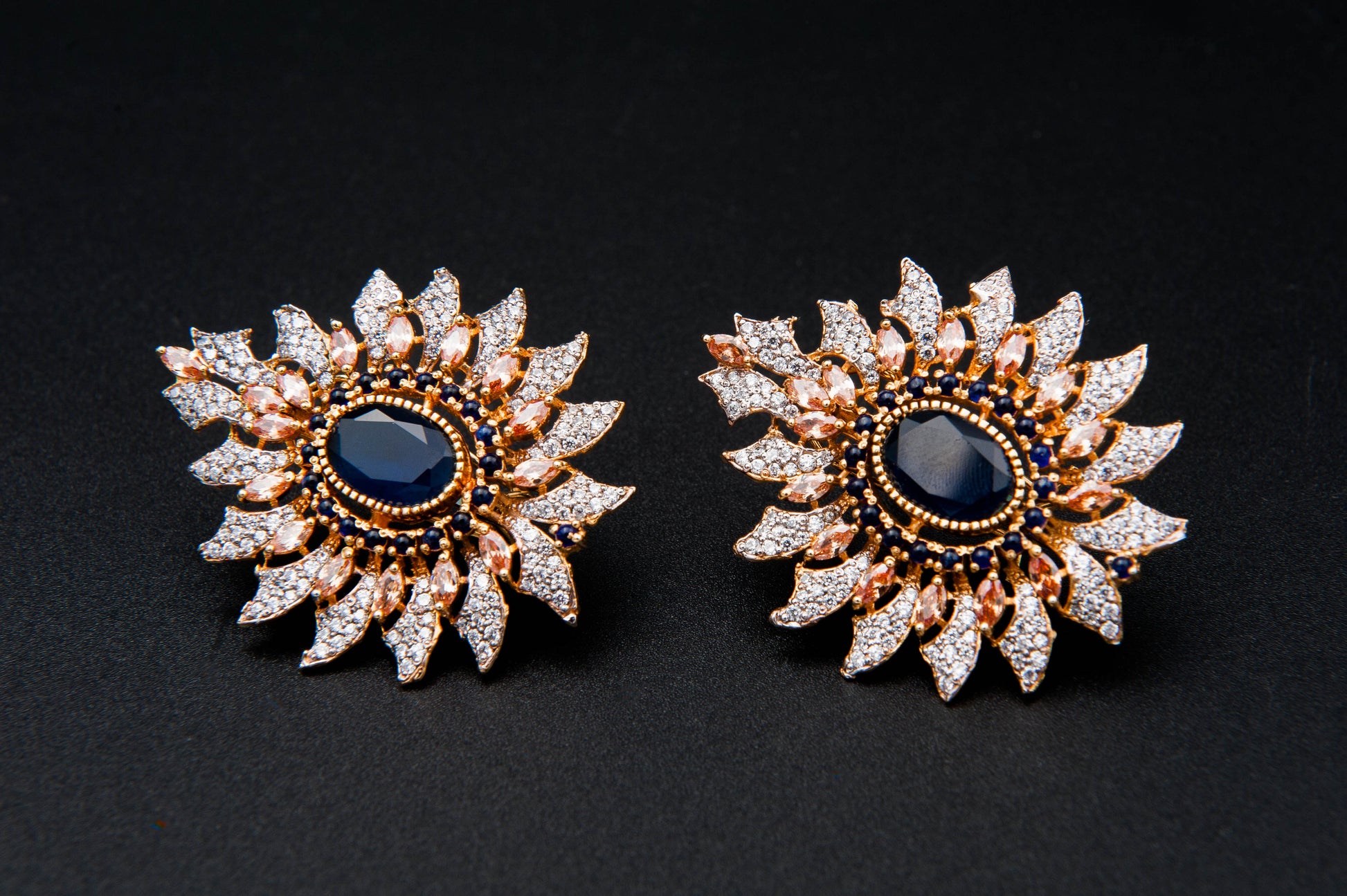 The Twilight Blossom set evokes a sense of refined elegance and floral charm, featuring a choker necklace and matching earrings adorned with deep-toned gemstones. The necklace centers around a dark oval gem framed by pink and white stones in a floral motif, set in gold-toned links and finished with a traditional beaded thread. The earrings mirror this aesthetic with dark blue central stones surrounded by radiant layers of pink and clear stones in a sunburst pattern. This set is ideal for evening occasions, blending classic beauty with a touch of dramatic sophistication.