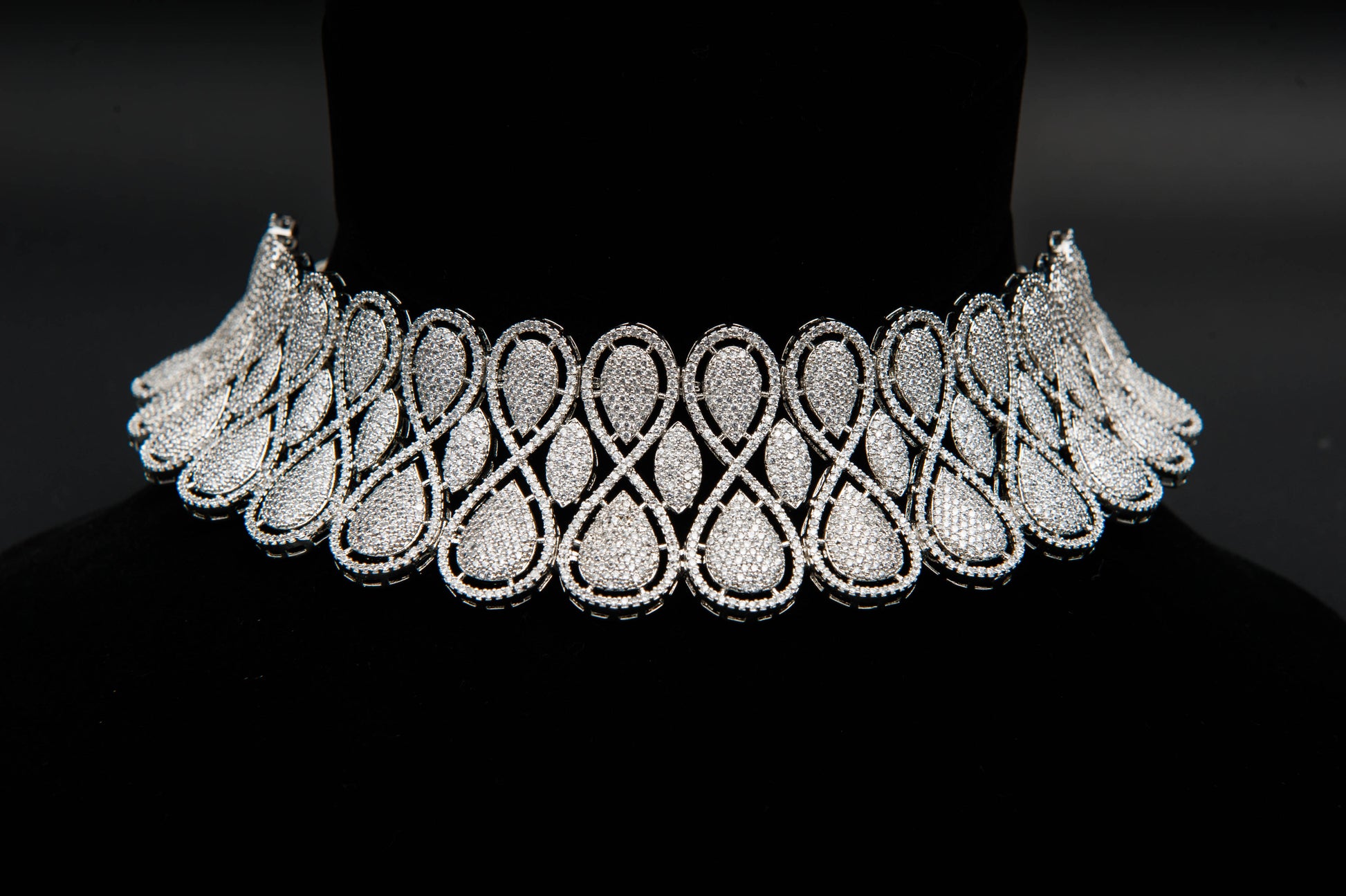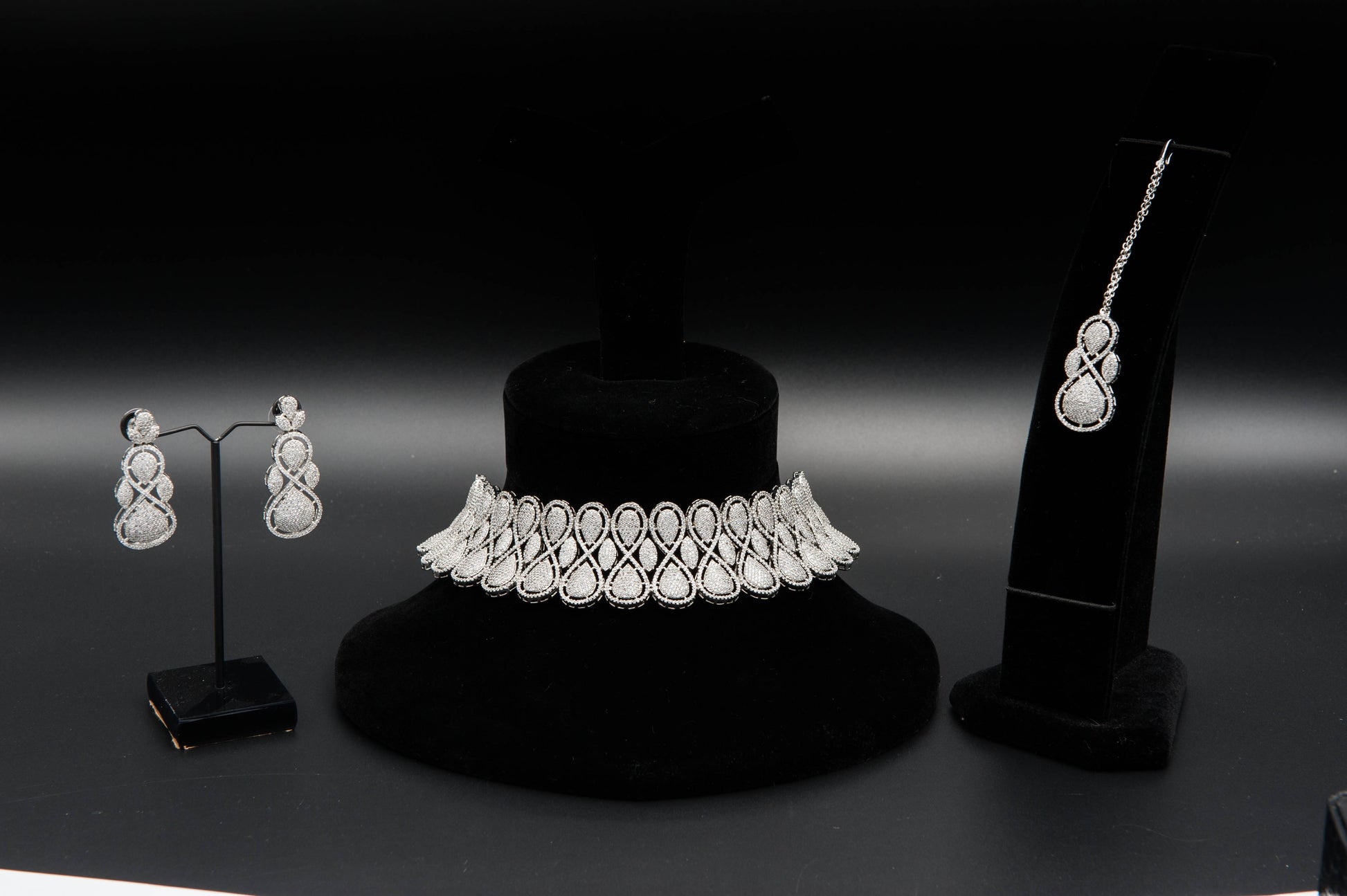 An intricate dance of loops and teardrops, this set captures the elegance of twilight shimmer. The choker necklace weaves silver filigree with sparkling stones in a symmetrical cascade, while the earrings and pendant echo the motif with graceful drop silhouettes. Each piece feels like a flourish of light caught in motion—perfect for evening occasions that call for quiet grandeur.
