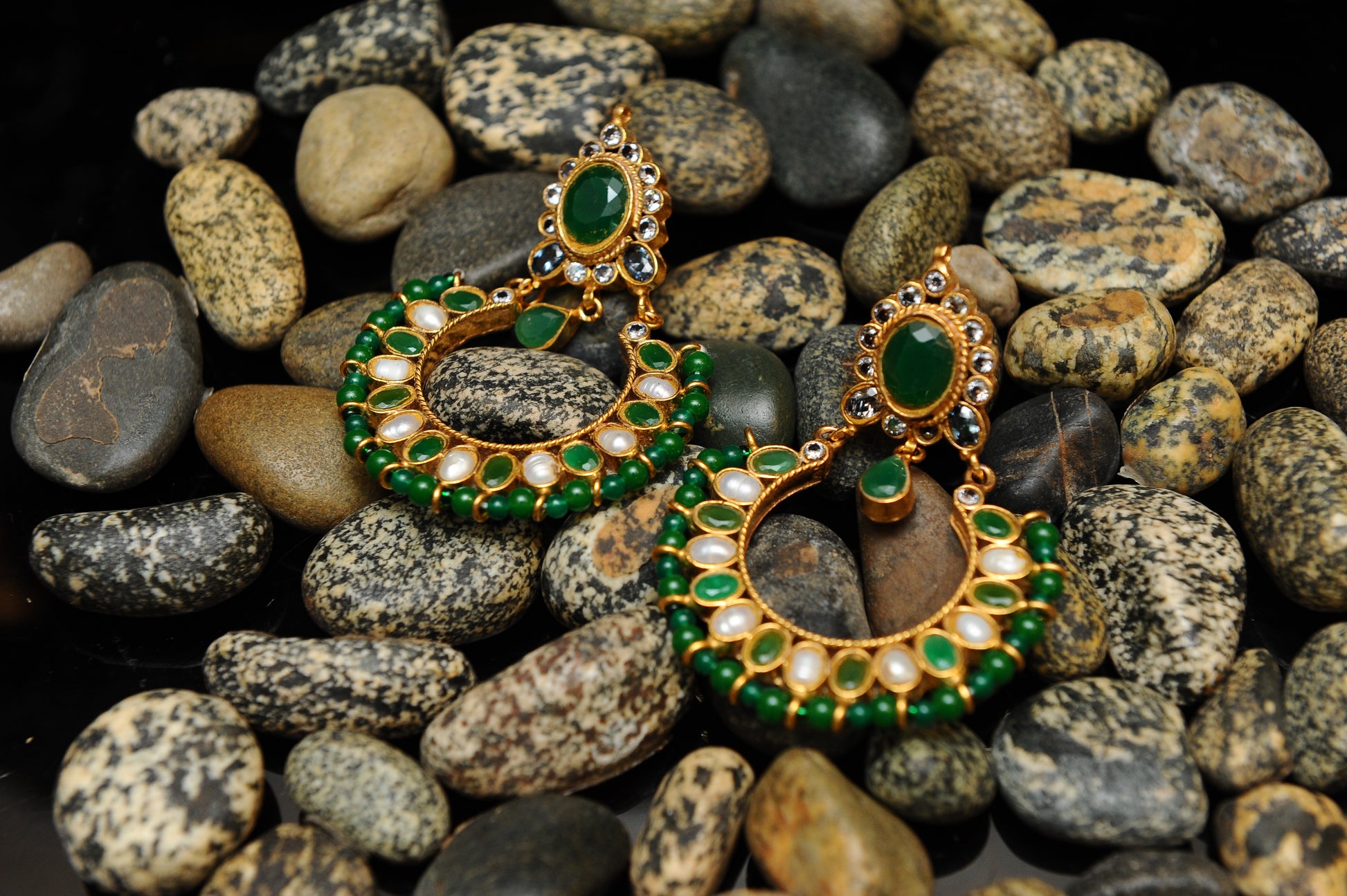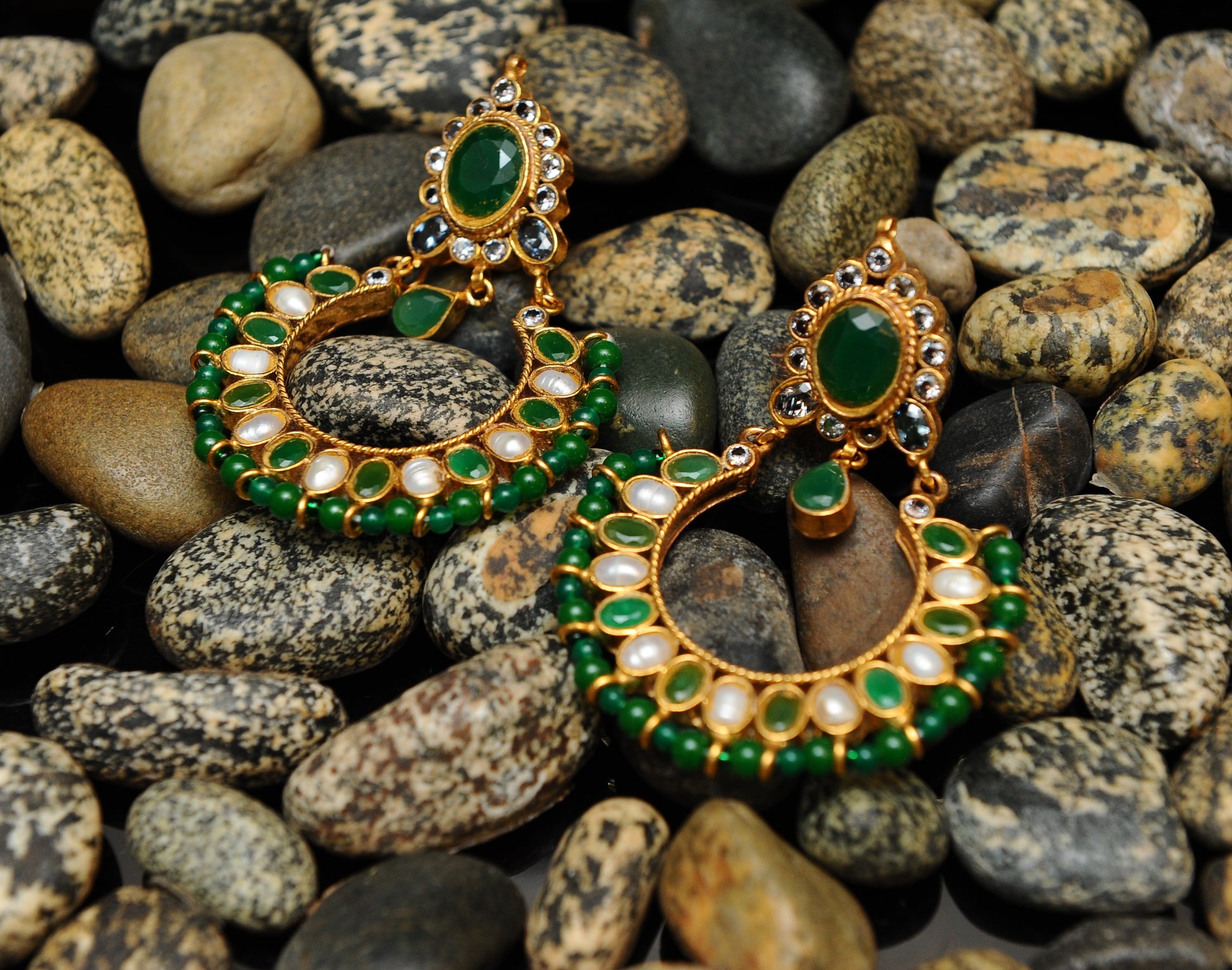 A regal pair of circular Kundan earrings featuring a central emerald-toned gem framed by clear stones, with a crescent-shaped lower section embellished in alternating green and white teardrops. Set in gold and styled against natural pebbles, these earrings evoke harmony and grandeur—perfect for ceremonial wear or festive elegance.