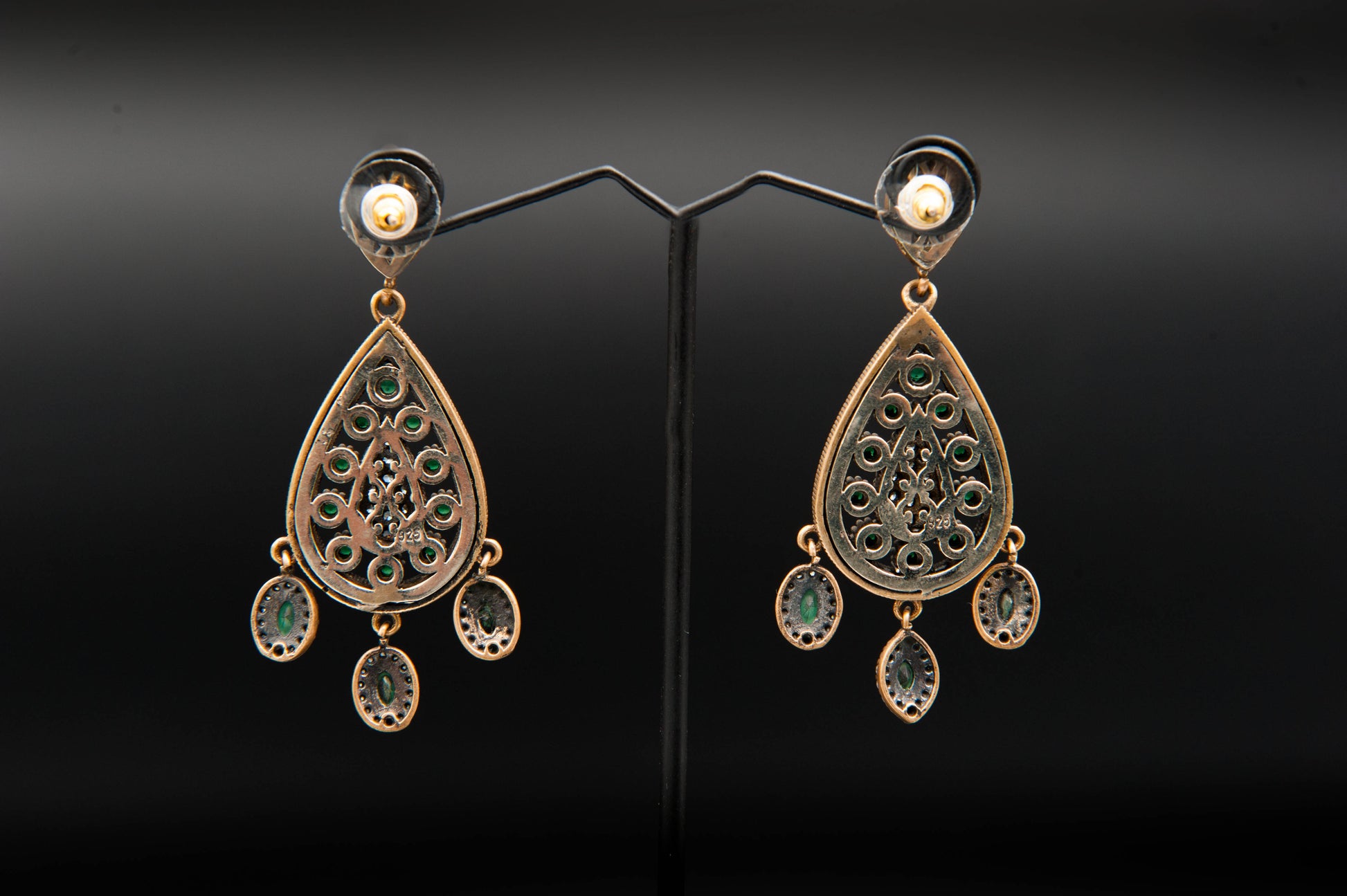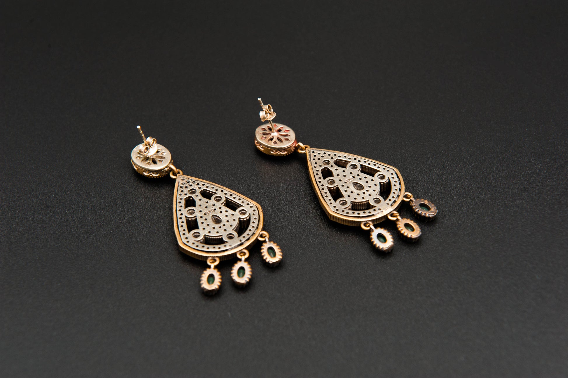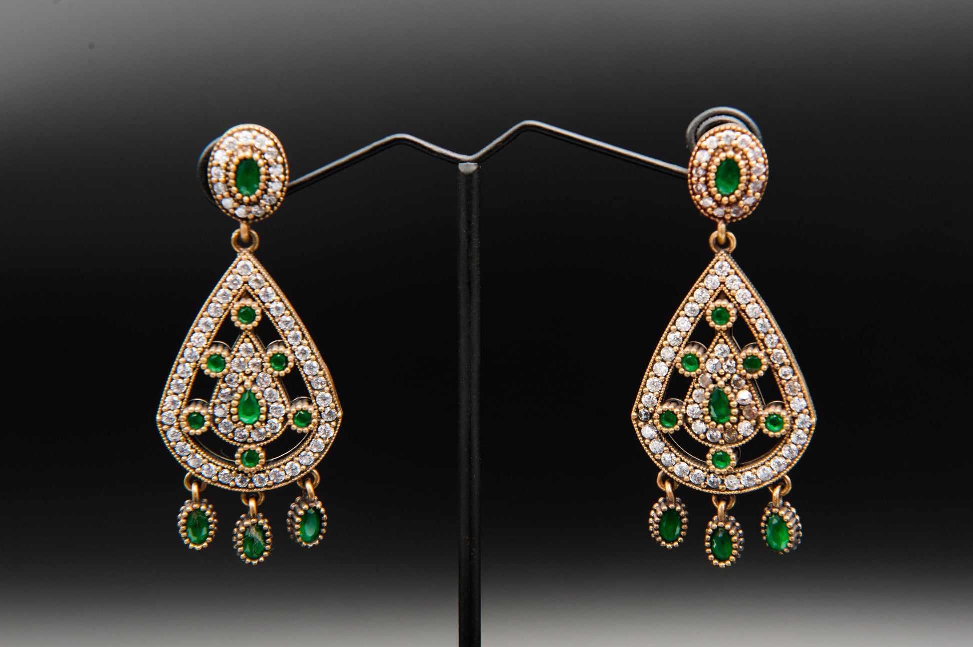 The Verdant Echoes earrings blend intricate filigree with a whisper of nature’s elegance. Crafted in radiant gold, each teardrop frame is pierced with symmetrical cutouts that evoke lacework and lightness. Suspended below, three oval dangles cradle lush green stones, their textured gold borders adding depth and richness. A floral-cut stud anchors the design, completing a look that’s both ornamental and organic—perfect for those who favor timeless charm with a botanical twist.