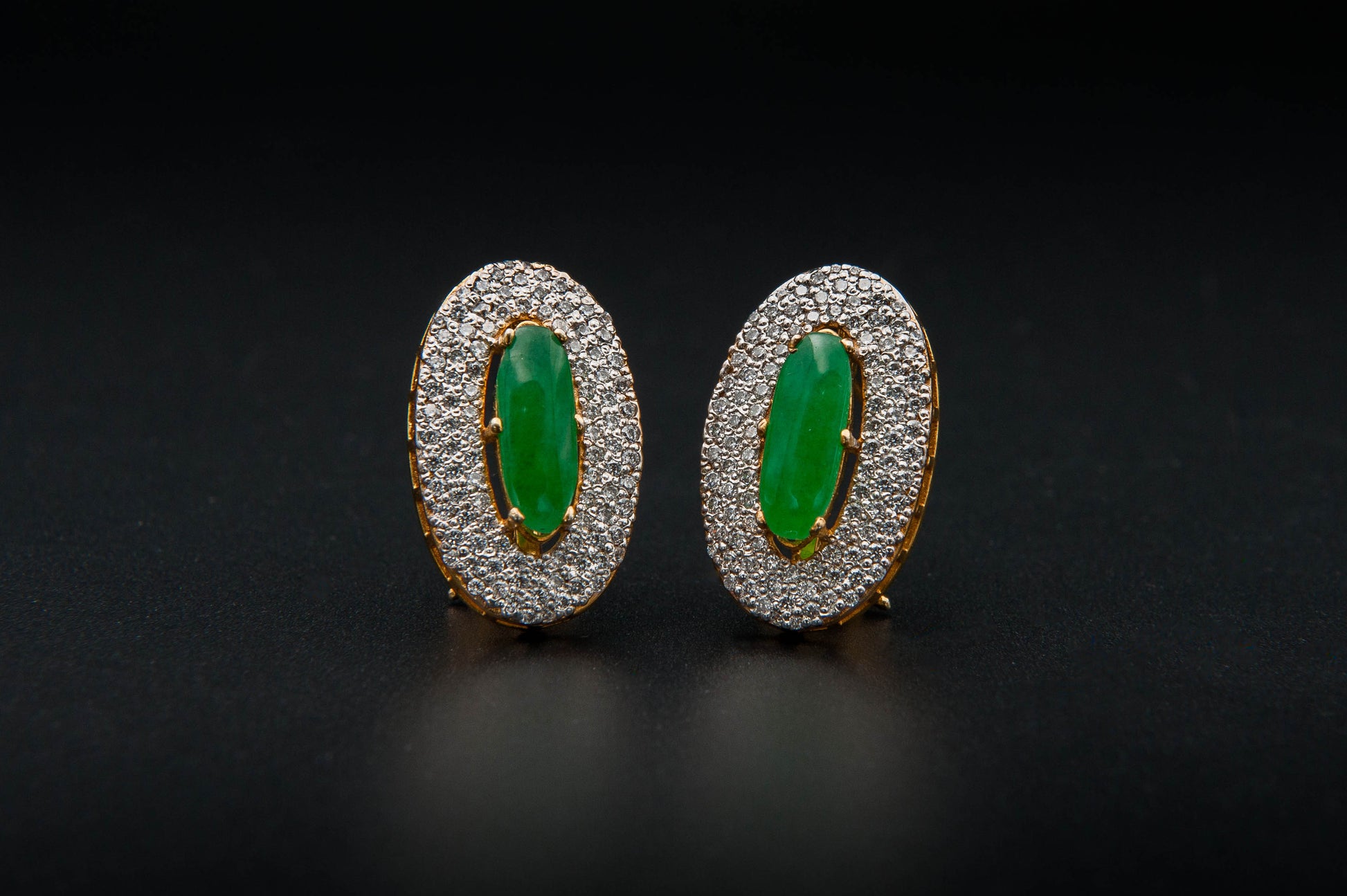 The Verdant Halo Earrings exude timeless sophistication with their rich green center stones—evoking the allure of emerald or jade—nestled in 925 sterling silver and finished with luxurious 24K gold plating. Each oval gem is embraced by a radiant border of sparkling white stones, forming a luminous halo that enhances the depth and brilliance of the centerpiece. With graceful gold prongs and a refined silhouette, these earrings are perfect for formal occasions or adding a touch of regal charm to everyday elegance.